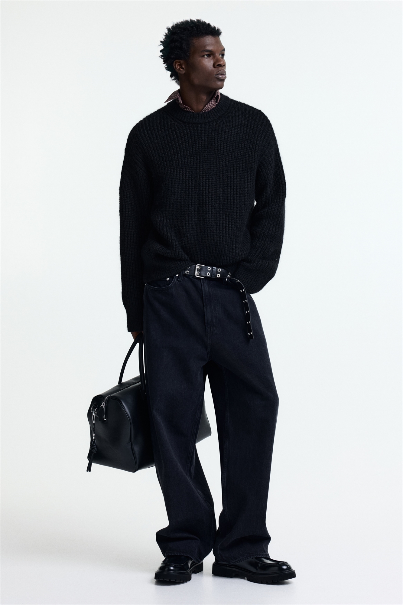 Джемпер из мягкого трикотажа в рубчик с круглым вырезом в рубчик, спущенными плечами и рубчиками на манжетах и подоле. Свободный крой для пышного, но не чрезмерно большого силуэта.