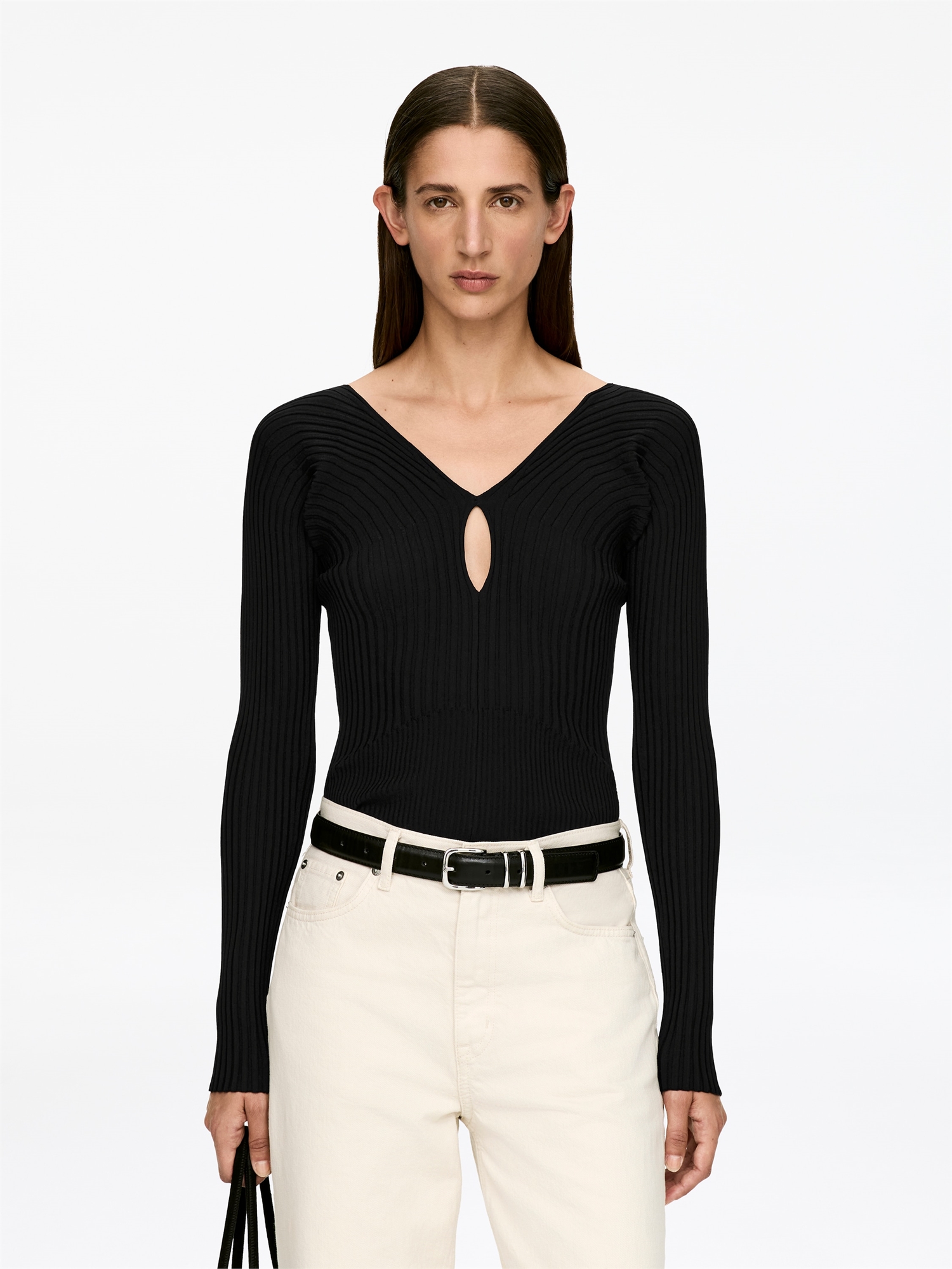 Трикотажный топ в рубчик с отверстием для ключа спереди и глубоким V-образным вырезом. Зауженный крой.