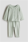 Трикотажный комплект из кардигана с пуантелью и брюк из тонкого трикотажа с гребешками и ребристой отделкой по краям. Кардиган с воротником, застежкой на пуговицы спереди и длинными рукавами. Брюки с регулируемым эластичным поясом и декоративным бантом.