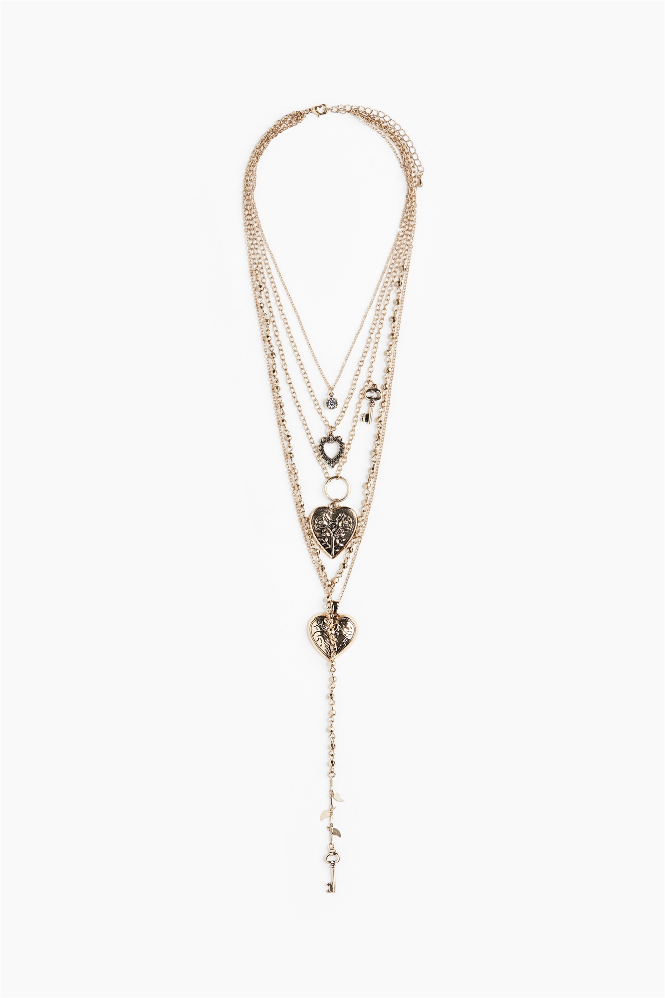 Пятижильное ожерелье из металлических цепочек разного дизайна с подвесками. Регулируемая длина с застежкой-триггером.