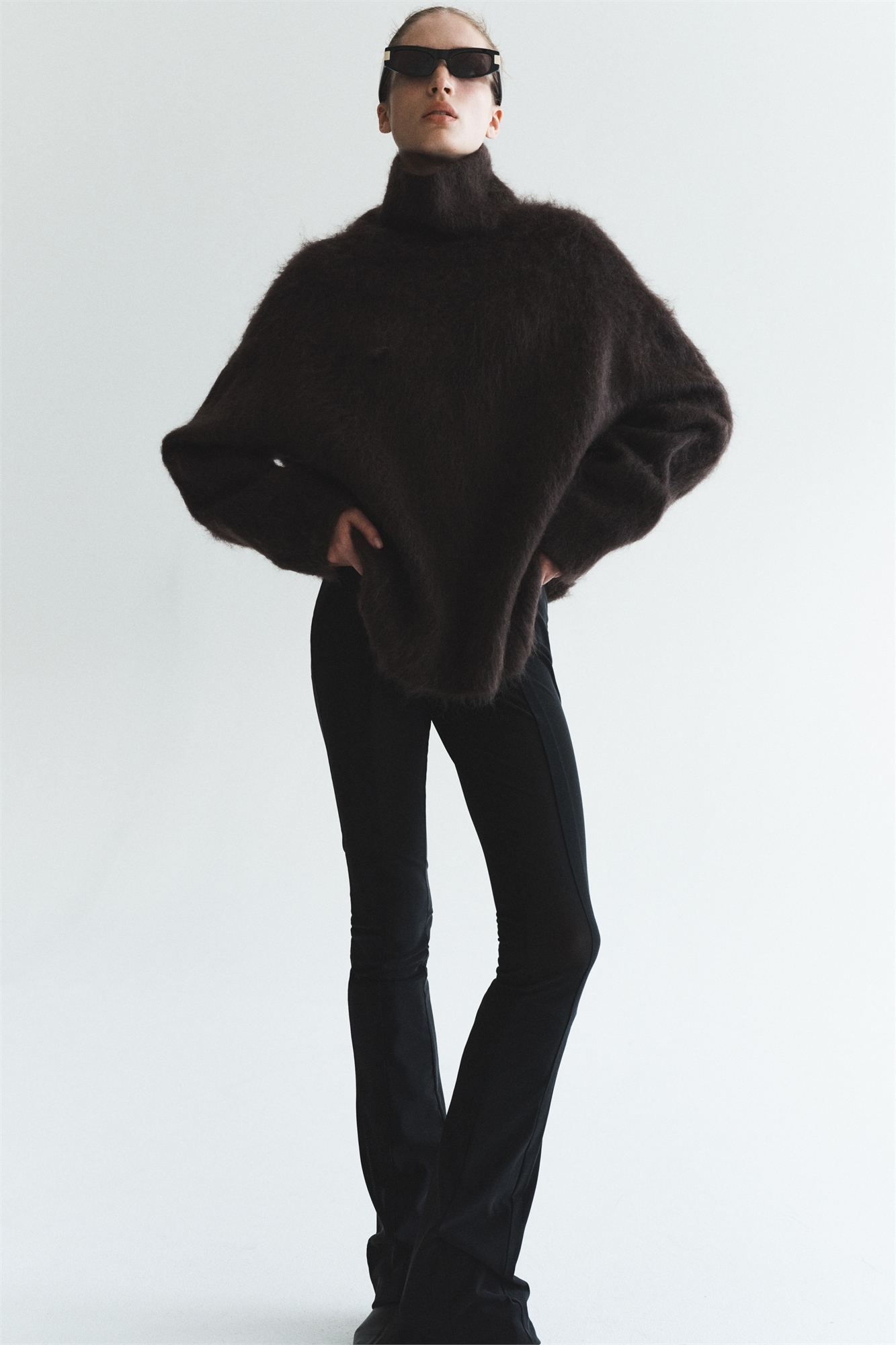 Облегающие брюки из эластичной сетки с передними вытачками, идущими от талии к подолу и тонко просвечивающими сквозь ткань. Регулярная талия с узким эластичным поясом, потайная застежка на молнию и крючок-глаз с одной стороны и вытачки сзади.