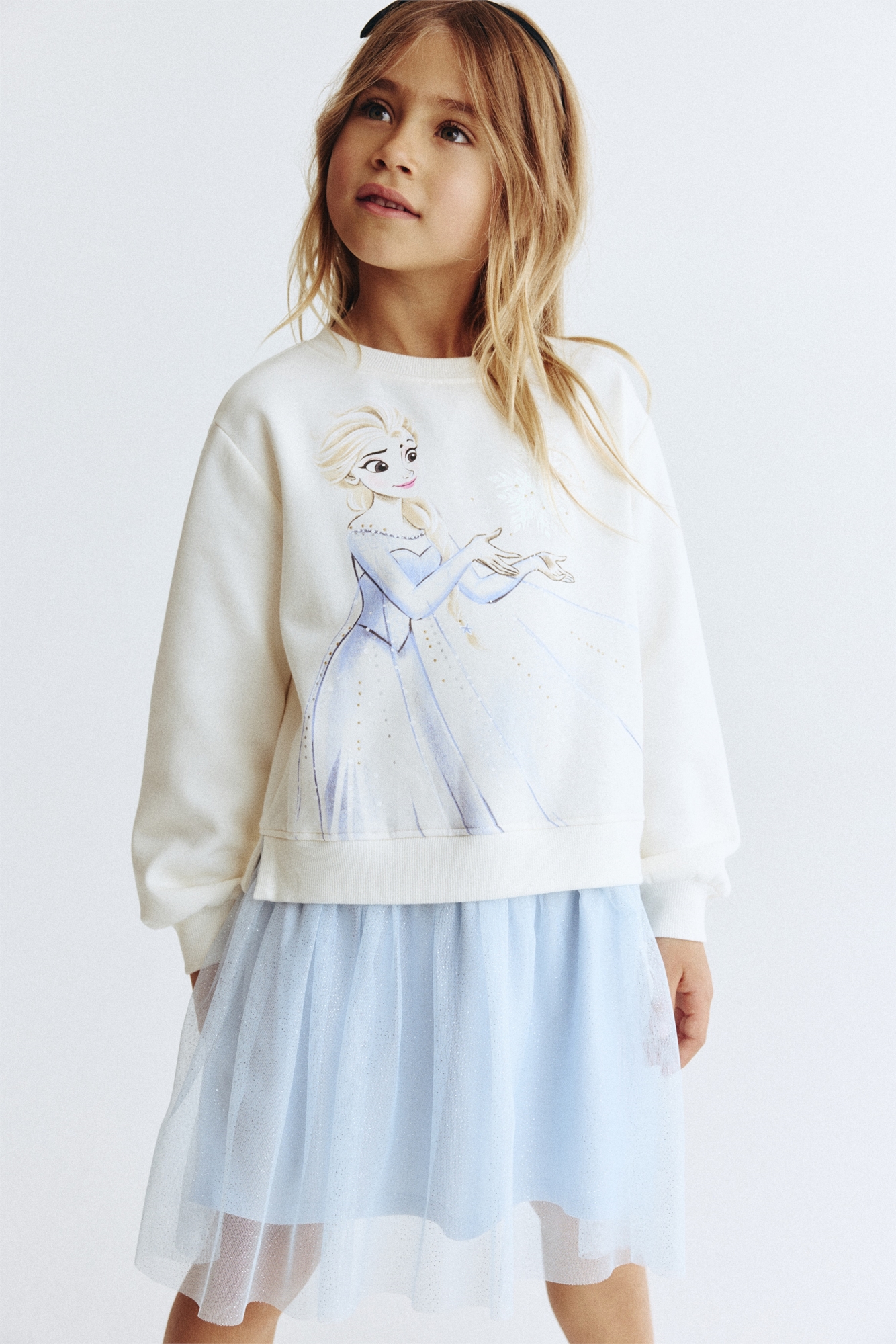 Свободное платье из принтованной толстовки с мягкой ворсистой изнанкой. Круглый вырез с ребристой отделкой и юбка, покрытая слоем тюля. Спущенные плечи и длинные рукава. Ребрышки на манжетах и подоле. На подкладке.