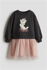 Свободное платье из принтованной толстовки с мягкой ворсистой изнанкой. Круглый вырез с ребристой отделкой и юбка, покрытая слоем тюля. Спущенные плечи и длинные рукава. Ребрышки на манжетах и подоле. На подкладке.