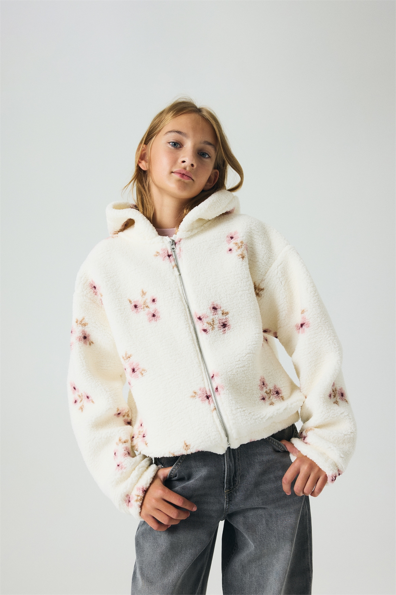 Толстовка на молнии из мягкого тедди с принтом по всей поверхности. Капюшон на подкладке, застежка-молния спереди с защитой подбородка от натирания, спущенные плечи и длинные рукава. Эластичные манжеты и подол.