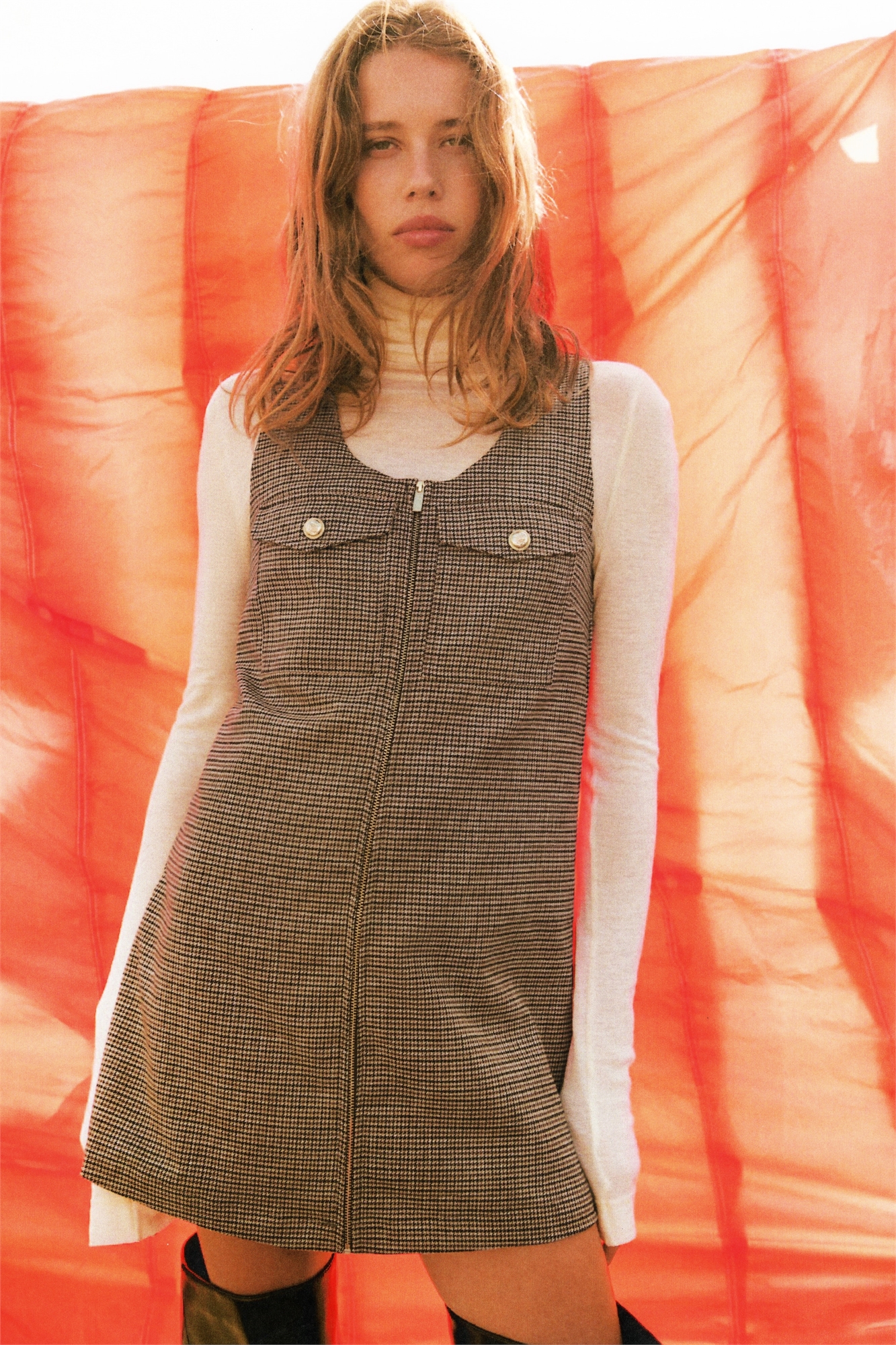 Короткое платье без рукавов из тканого материала с вырезом-лодочкой и застежкой-молнией спереди. А-линия силуэта с накладными нагрудными карманами с металлической пуговицей. На подкладке.