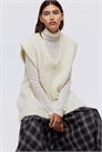 Жилет из мягкого трикотажа с содержанием мохера и шерсти. Свободный крой с ребристым V-образным вырезом горловины и окантовкой по проймам и подолу.