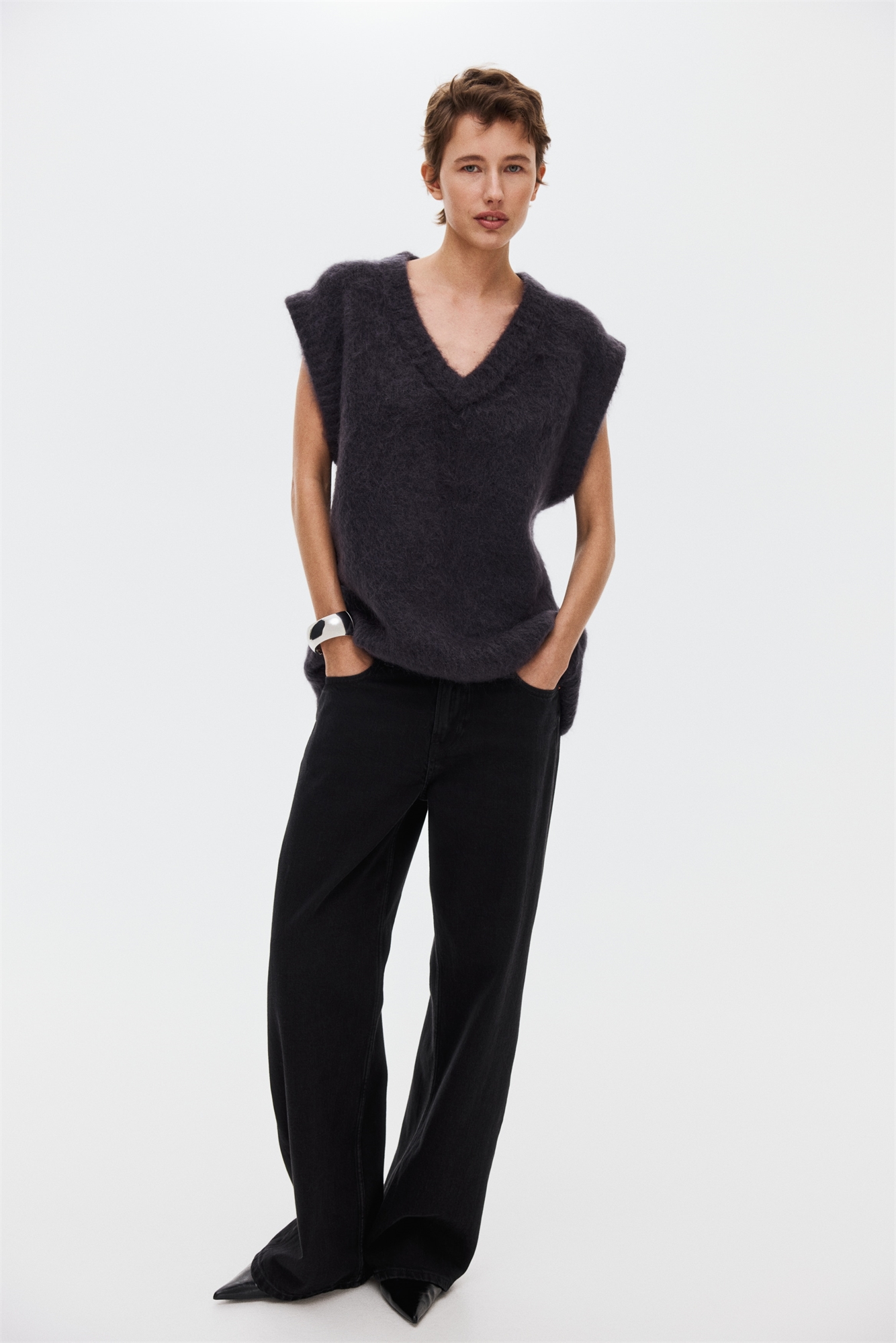 Жилет из мягкого трикотажа с содержанием мохера и шерсти. Свободный крой с ребристым V-образным вырезом горловины и окантовкой по проймам и подолу.