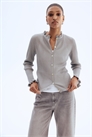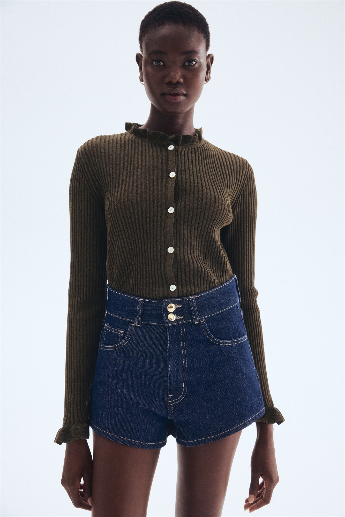 Кардиган из мягкого трикотажа в рубчик с небольшим воротником с оборками, пуговицами спереди и длинными рукавами с манжетами с оборками.