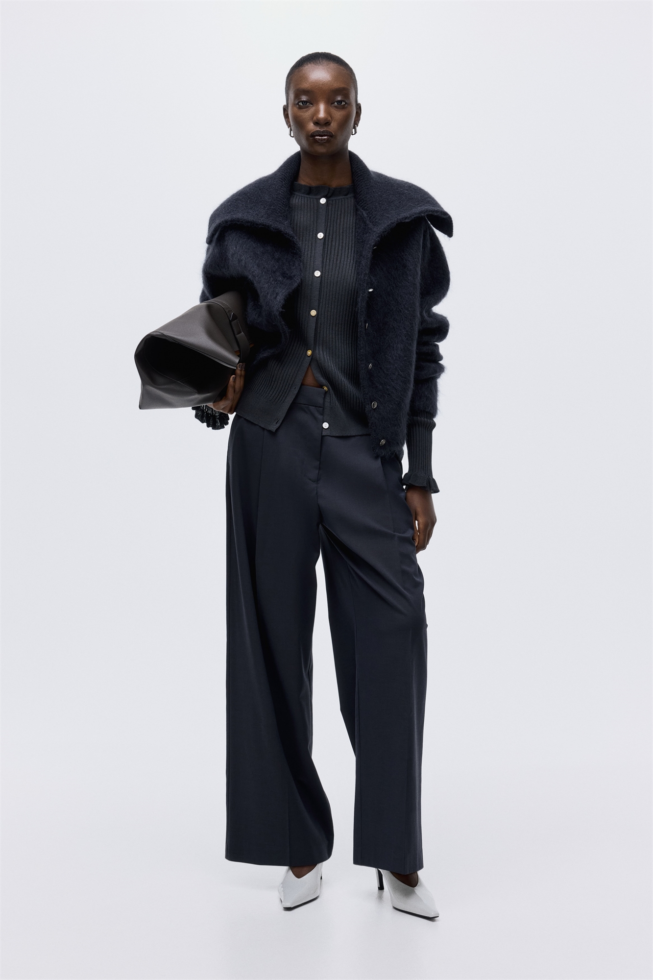 Кардиган из мягкого трикотажа в рубчик с небольшим воротником с оборками, пуговицами спереди и длинными рукавами с манжетами с оборками.