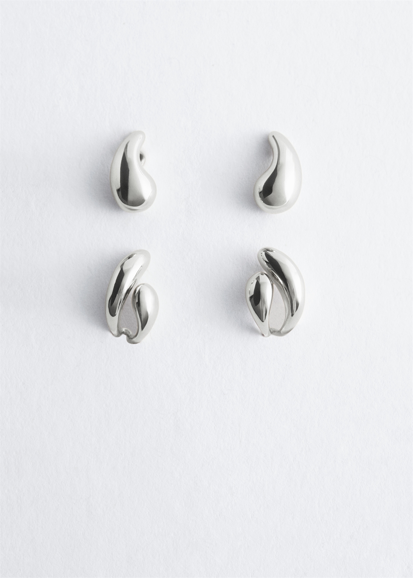 В этот комплект входят две пары блестящих серег, каждая из которых имеет округлую форму, изгибающуюся под мочкой уха. В одной паре дизайн состоит из двух частей, которые определяются центральным вырезом. Застежки-бабочки с никелевым покрытием