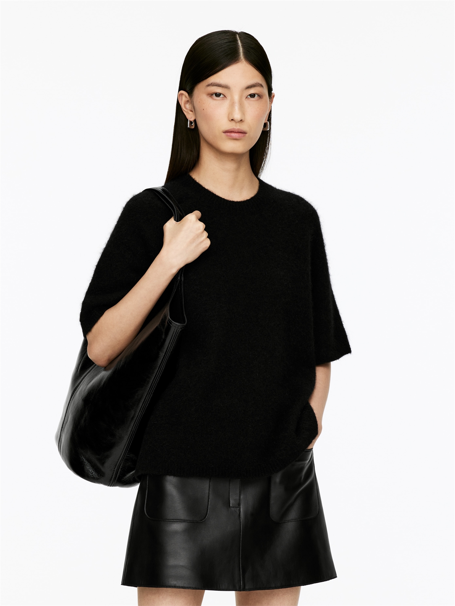 Джемпер с короткими рукавами, свободным кроем и ребристой отделкой. Этот фасон содержит 31% альпаки RAS и 31% шерсти RWS (TE-00047206). Продукция, сертифицированная по стандартам Responsible Wool Standard (RWS) и Responsible Alpaca Standard (RAS), содержит шерсть и волокно альпака с ферм, прошедших независимую сертификацию на соответствие требованиям по благополучию животных и землепользованию.