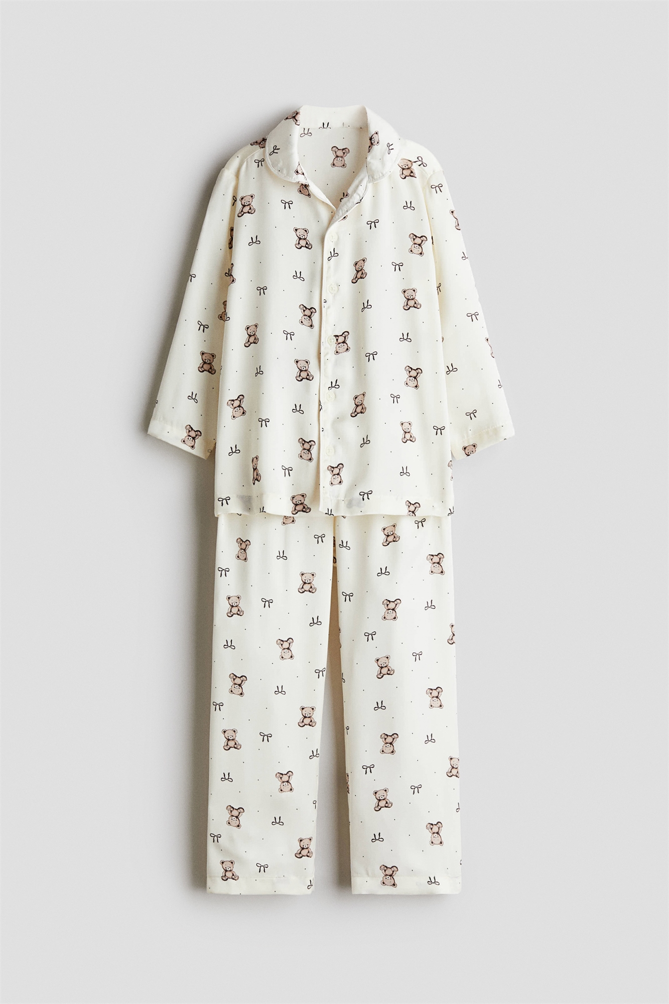Пижама с рубашкой и нижней частью из мягкого атласа с принтом по всей поверхности и контрастной цветной отделкой. Рубашка с длинными рукавами, отложным воротником и пуговицами спереди. Низ с эластичной талией и прямыми ножками.