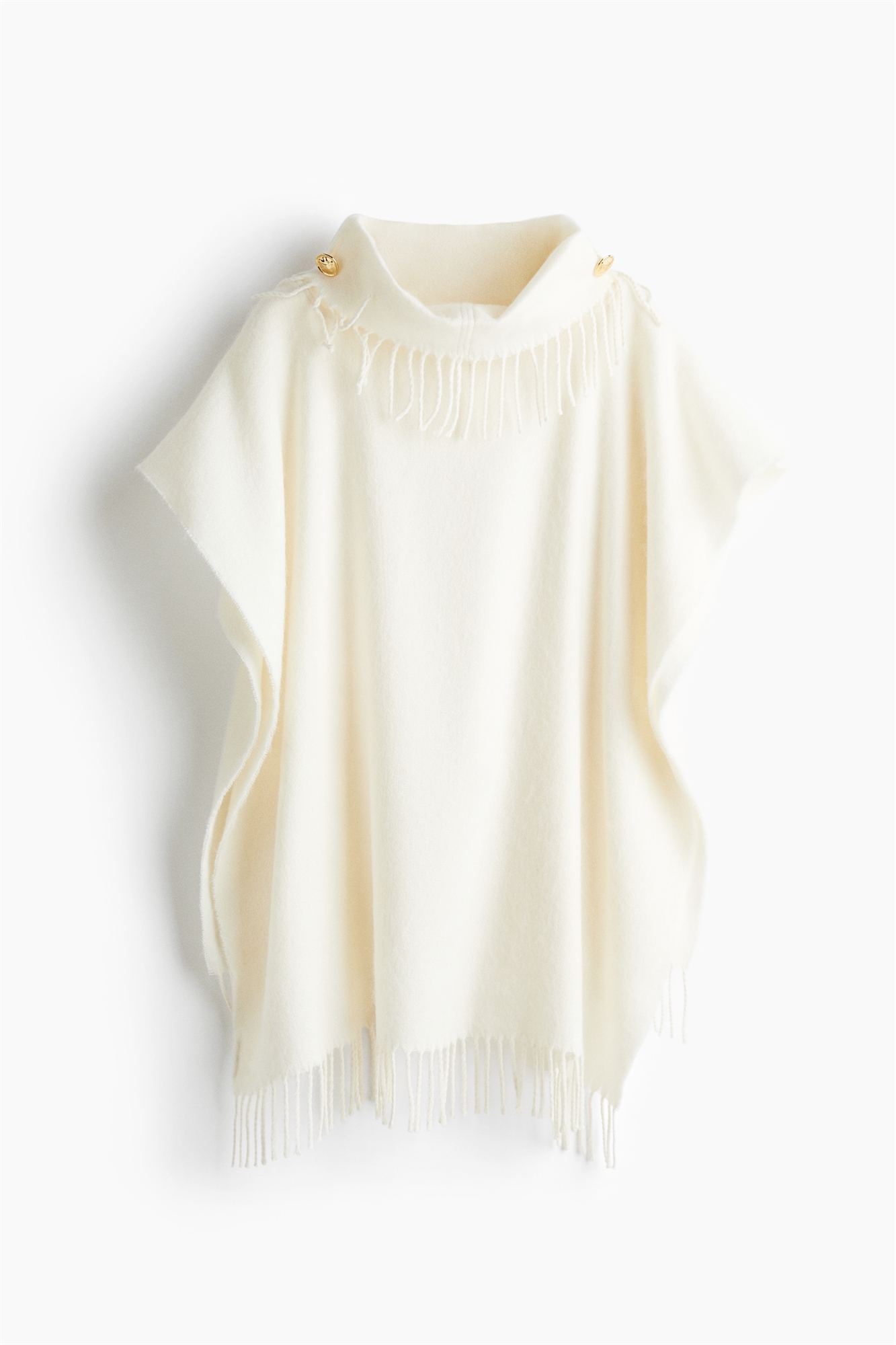 Накидка из мягкой ткани с отделкой бахромой, горловиной поло и металлической пуговицей с каждой стороны, а также подолом с отделкой бахромой.