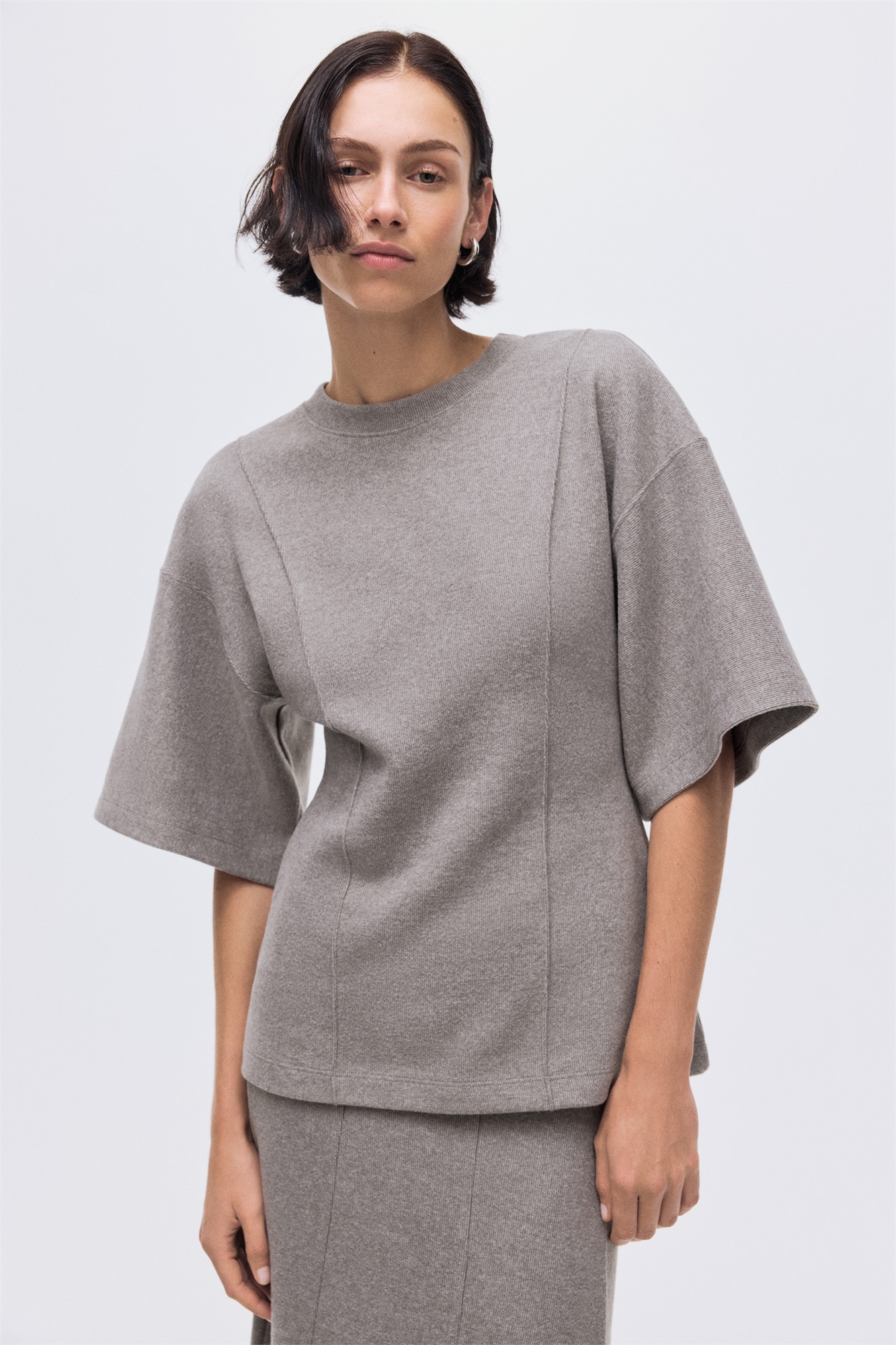 Свободный топ из тонкого трикотажа с горловиной, видимыми швами спереди, спущенными плечами и широкими рукавами длиной до локтя. Аккуратный расклешенный подол.