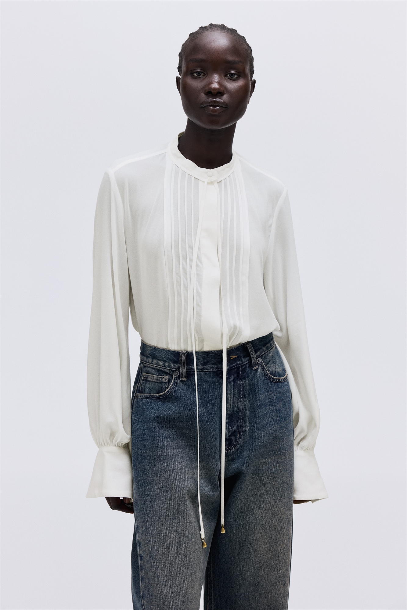Длинная блузка из вискозного крепа с воротником-бантом и узкими завязками спереди. Скрытая пуговичная лента и пинетки спереди. Длинные рукава-баллоны с разрезом и пуговицей на манжетах. Закругленный подол.
