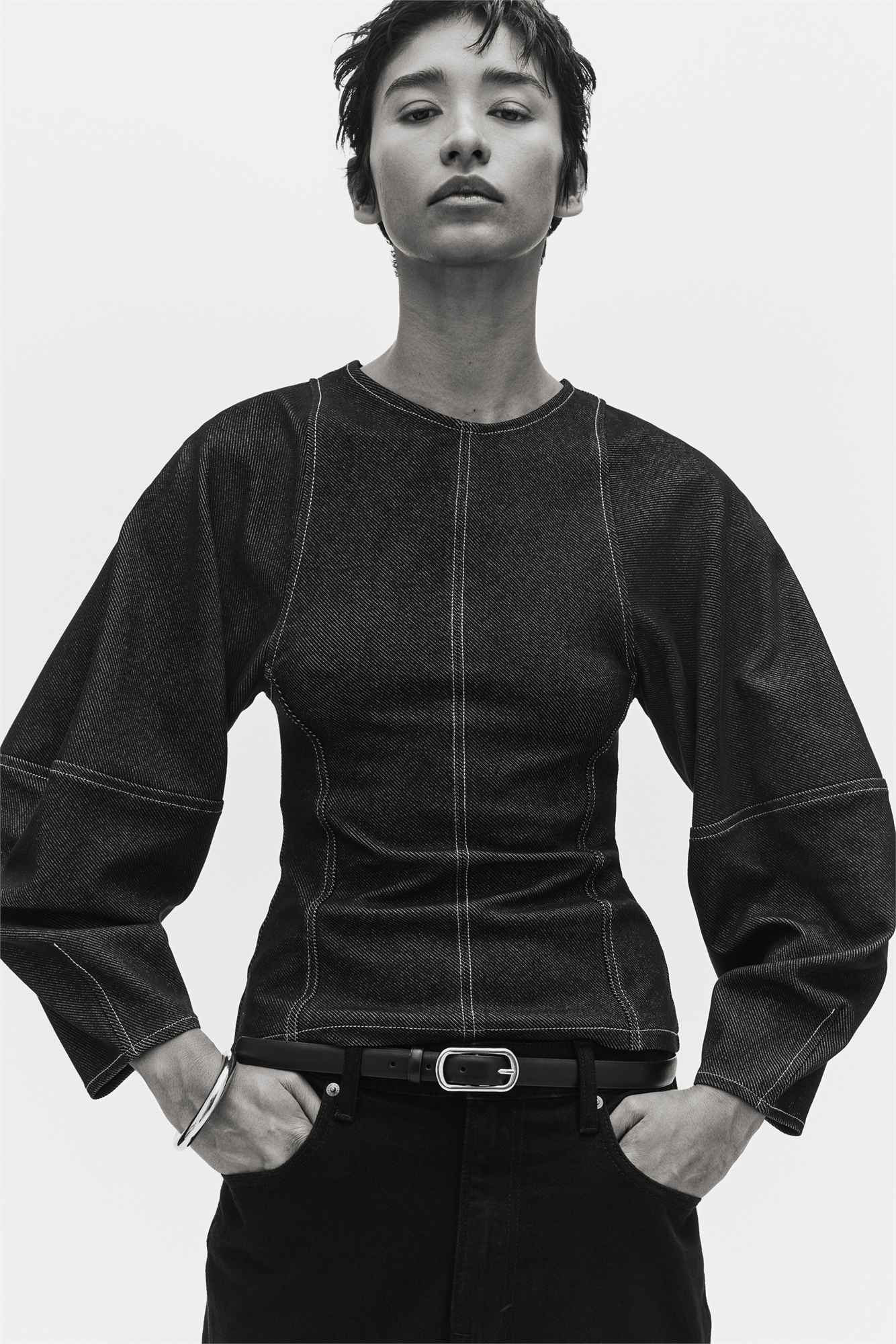 Облегающий топ из джинсового трикотажа, украшенный строчками контрастного цвета. Круглый вырез, застежка-молния сзади и длинные объемные рукава.