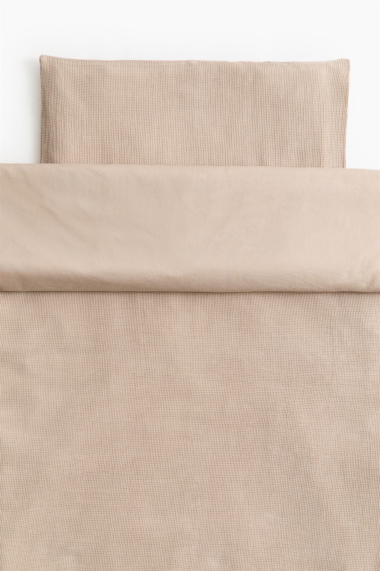 Комплект постельного белья из мягкого хлопка с вафельной текстурой на лицевой стороне и однотонной обратной стороной. В комплект входит один пододеяльник со скрытыми кнопками внизу и одна подушка с застежкой-конвертом.