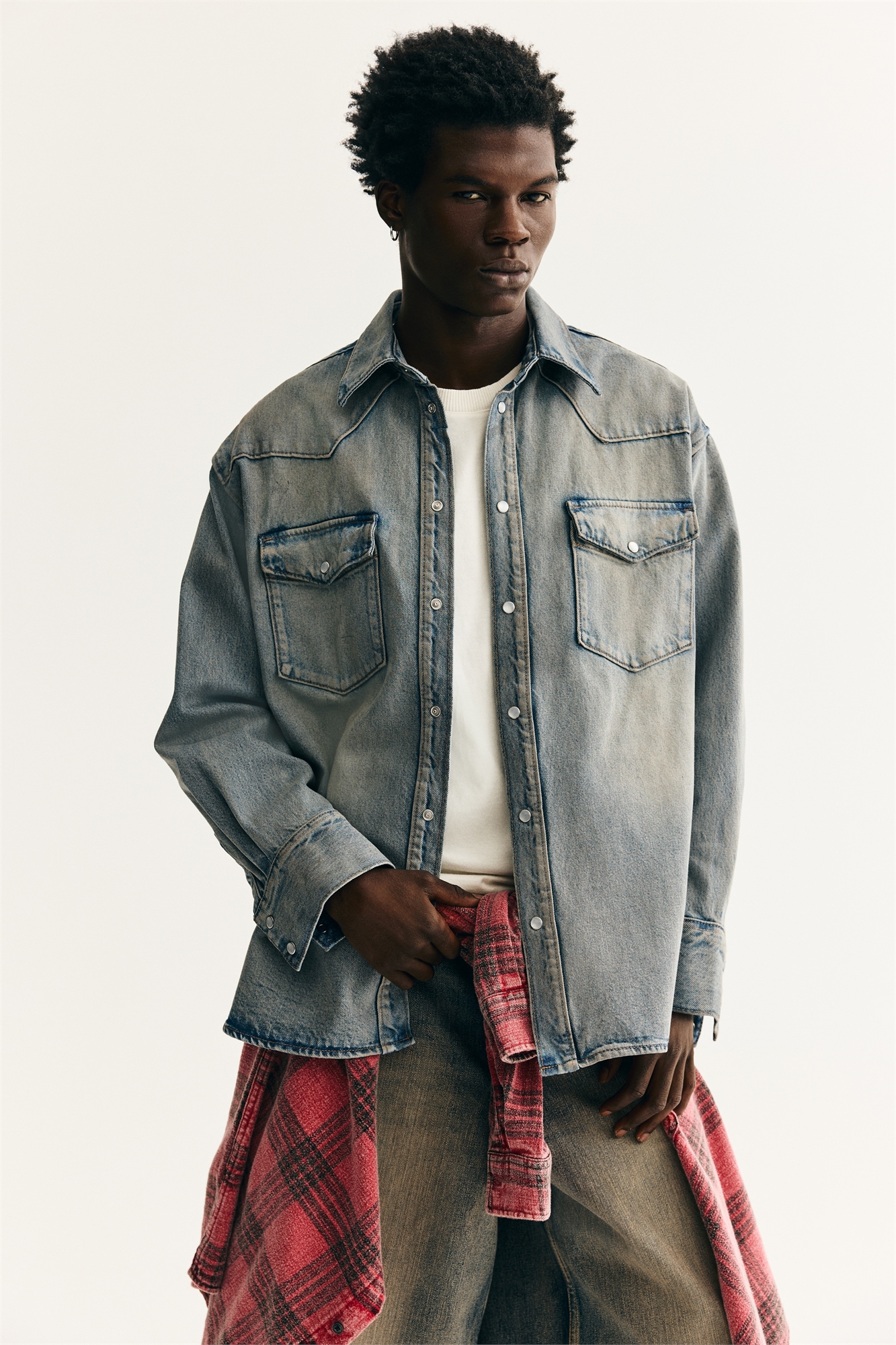 Рубашка в стиле вестерн из жесткого хлопкового денима с воротником, застежками на кнопках спереди и ярмом спереди и сзади. Накладные нагрудные карманы с прижимом и длинные рукава с рукавной планкой и прижимом на манжетах. Закругленный подол. Завышенная посадка для придания мешковатого и свободного силуэта.