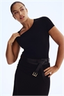 Боди из мягкой микрофибры с круглым вырезом и короткими рукавами. Скрытые кнопки в промежности и высокий разрез сзади.