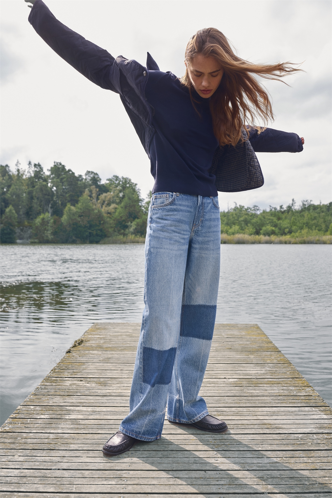 Джинсы с 5 карманами из жесткого хлопкового денима с рисунком в стиле пэчворк, который сначала кажется упругим, но затем смягчается и ослабевает при носке. Широкие штанины с обычной посадкой от талии до бедер и широким кроем от бедра до подола. Завышенная талия с ширинкой на молнии и пуговице. Удлиненная длина, созданная для того, чтобы ниспадать по ноге с эффектом укладки. Широкий силуэт, который всегда выглядит привлекательно.