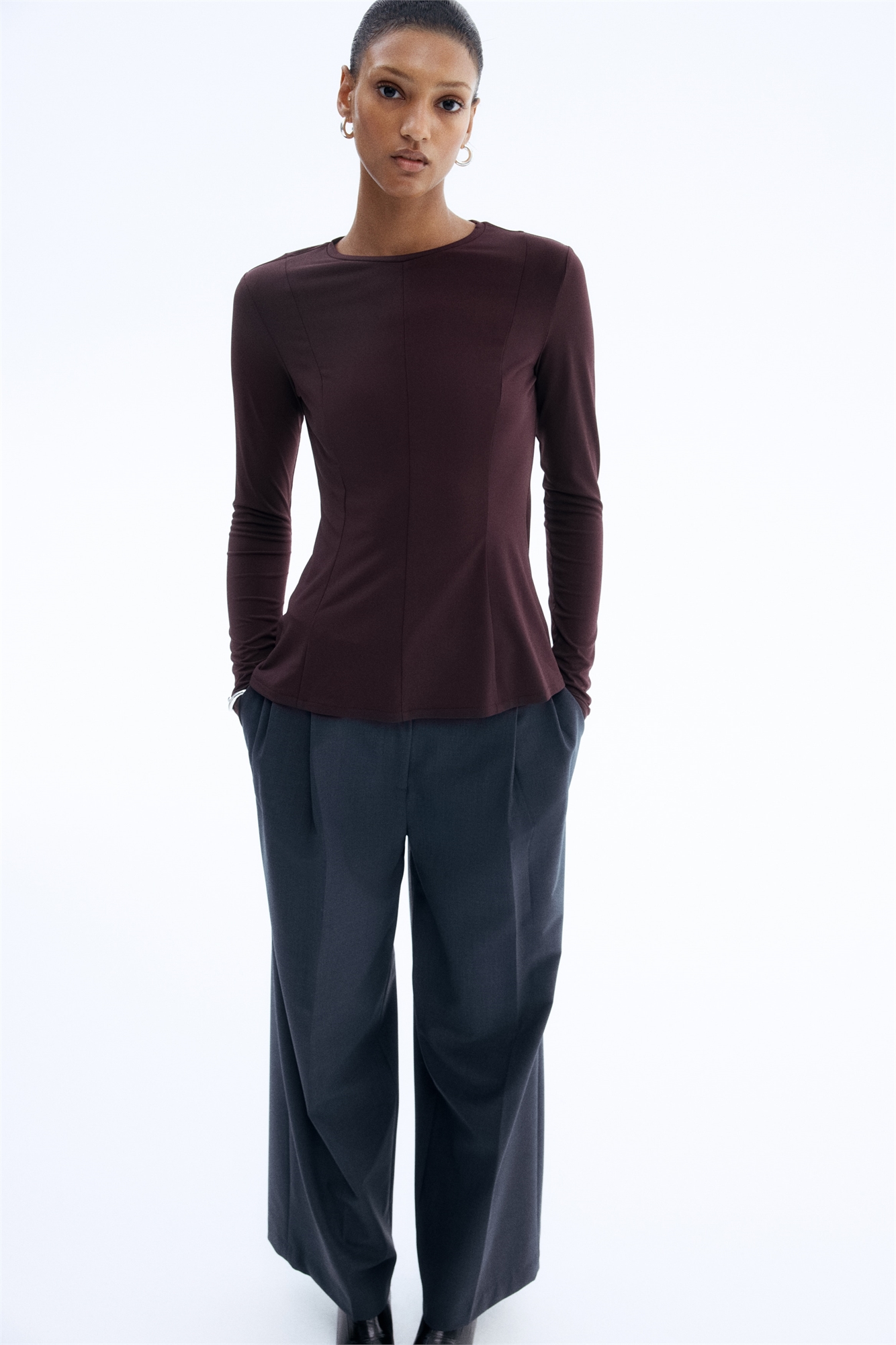 Топ с длинными рукавами из крепового джерси с круглым вырезом, фигурными швами спереди и сзади и расклешенным пеплумом.