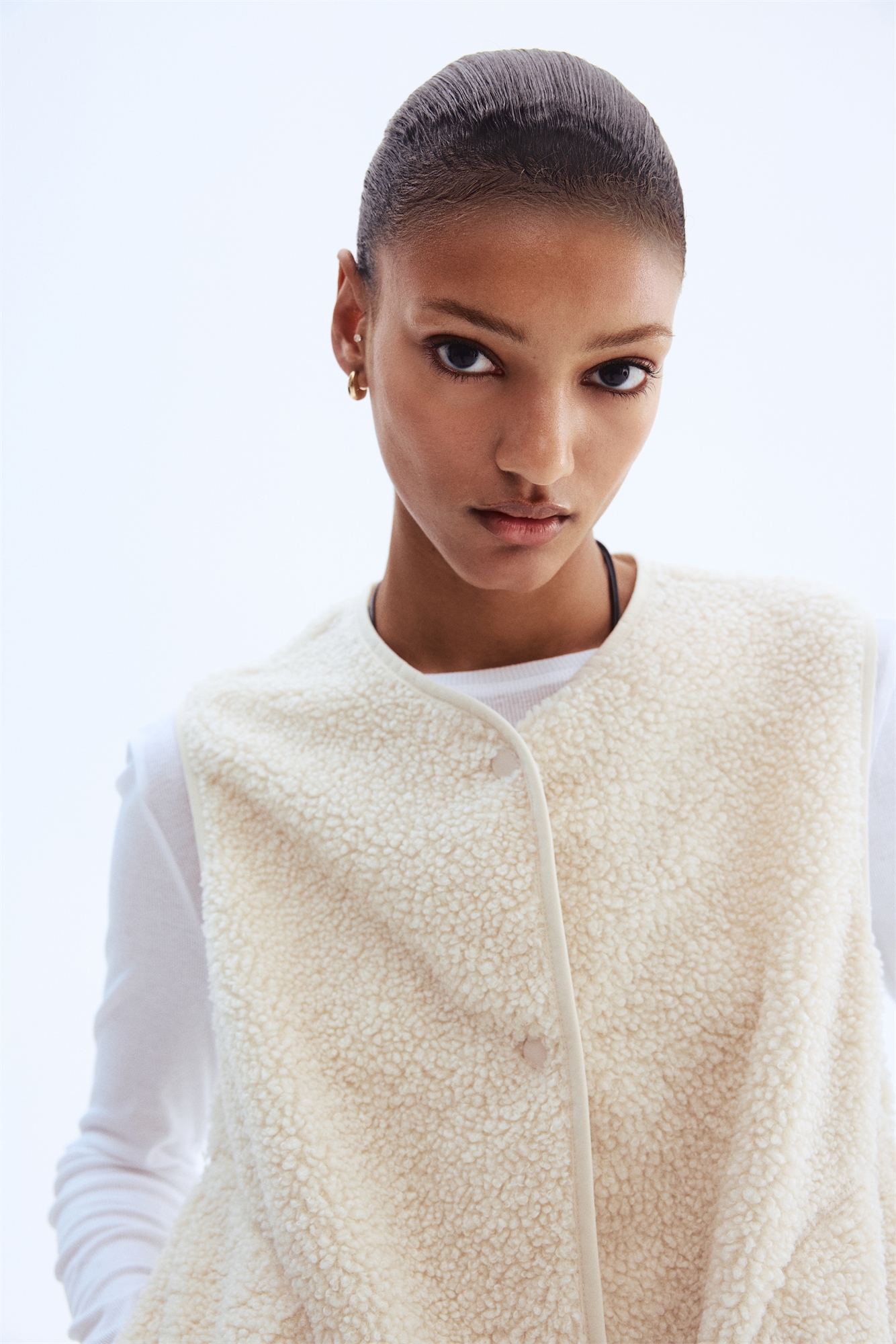 Жилетка из мягкого тедди с узкой обвязкой по краям. Круглый вырез, пуговицы спереди и боковые карманы.