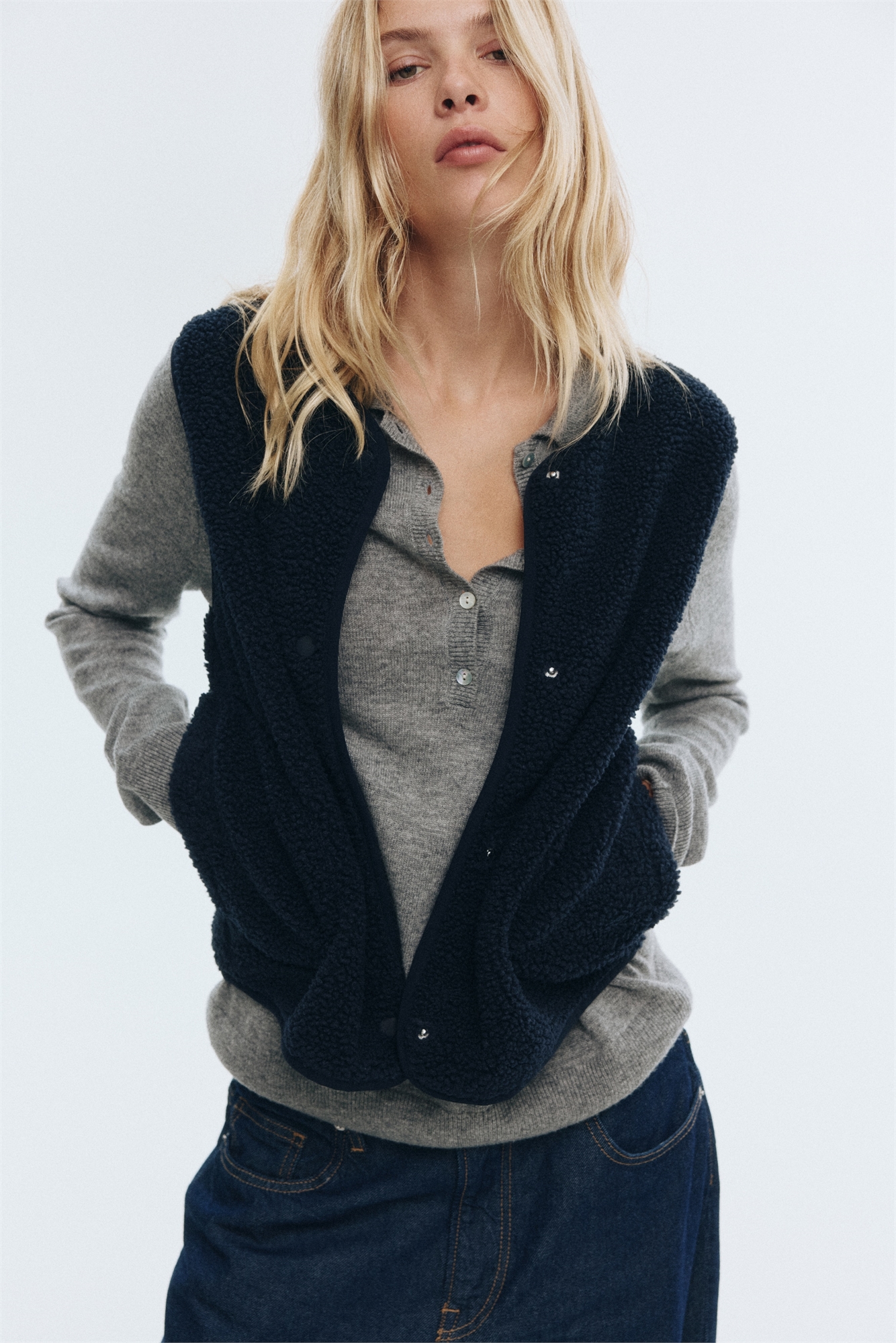 Жилетка из мягкого тедди с узкой обвязкой по краям. Круглый вырез, пуговицы спереди и боковые карманы.
