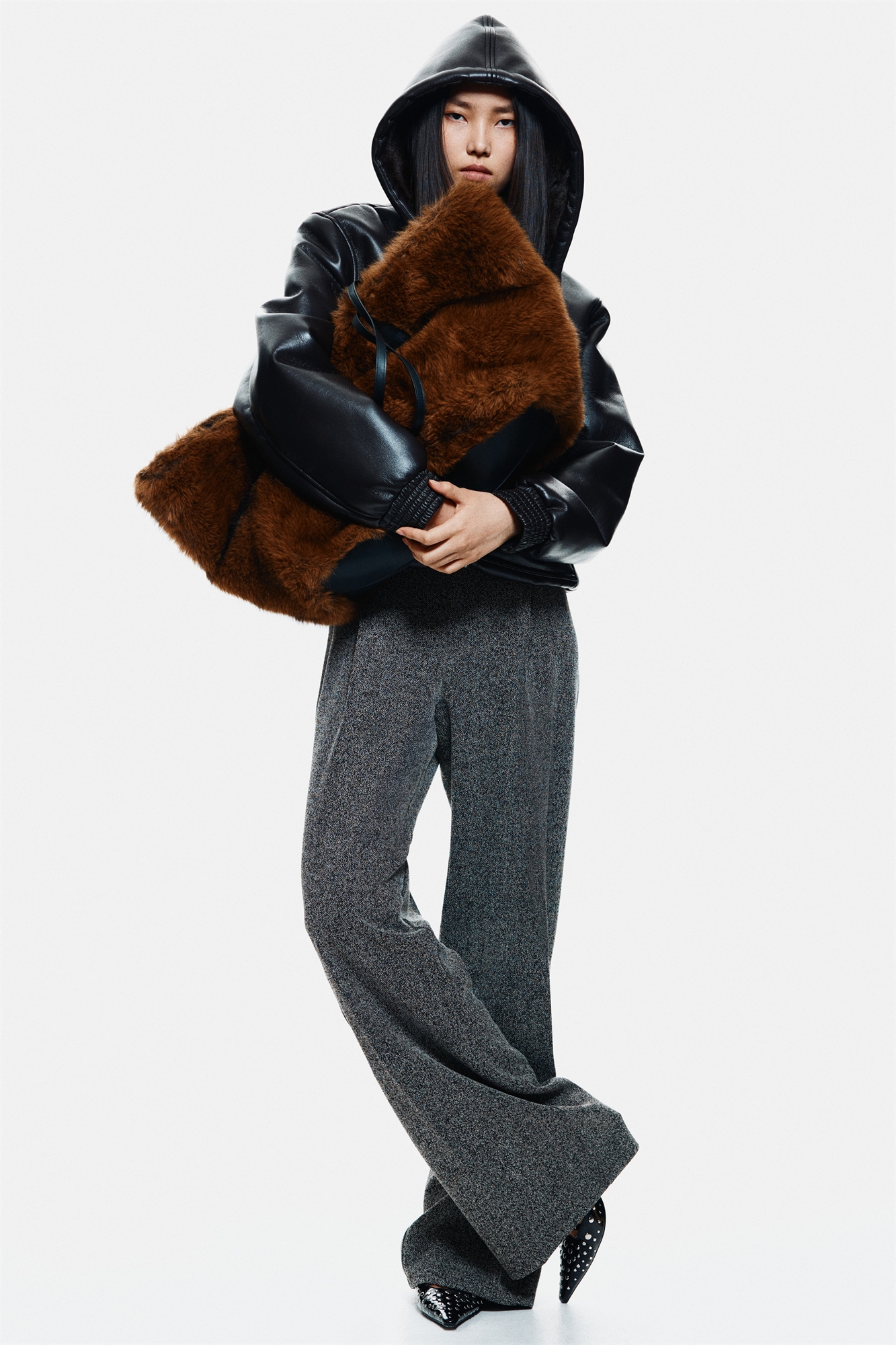 Брюки из джерси с высокой талией и скрытой эластичной резинкой. Прямые ноги со складками и заломами спереди.