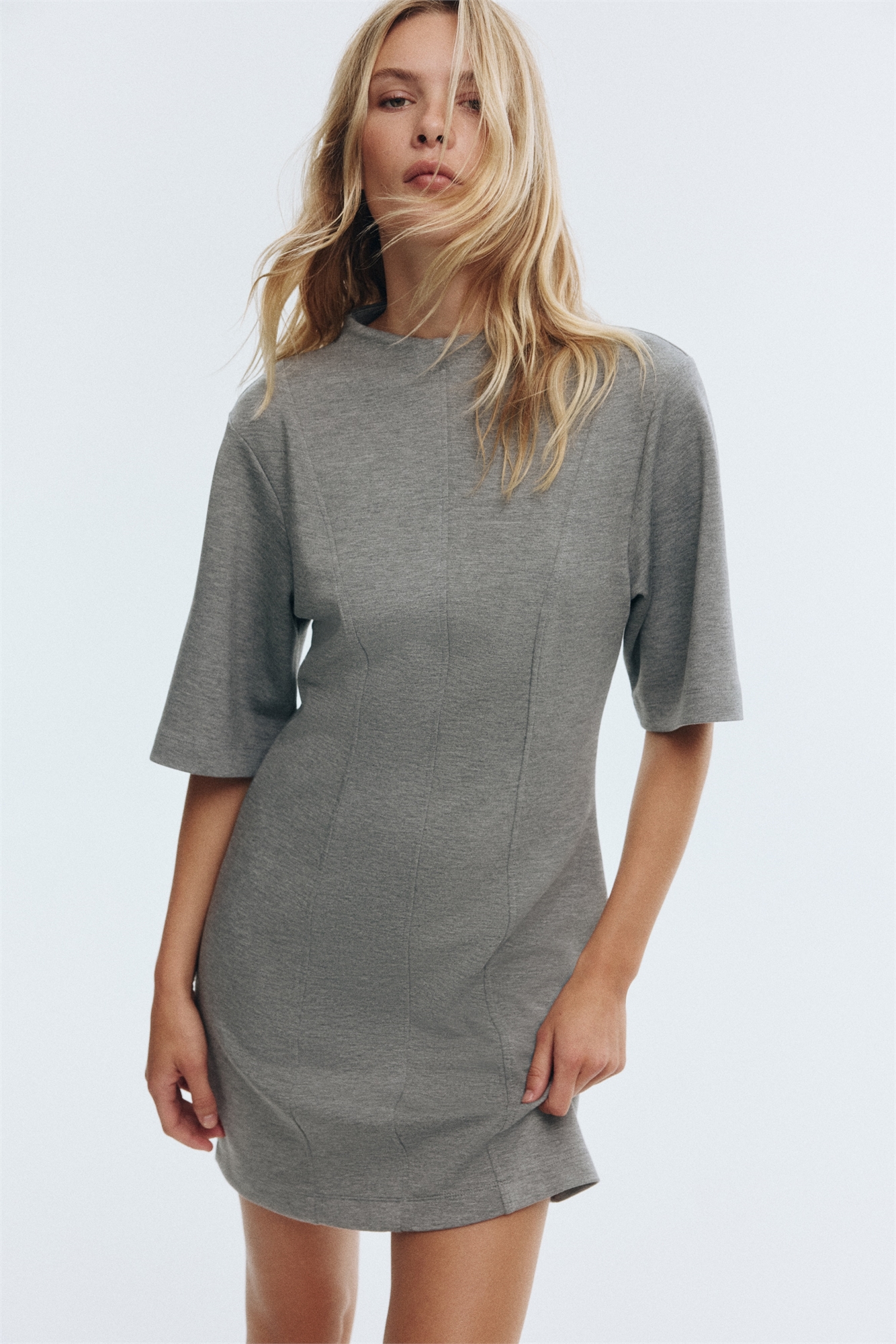 Мини-платье из мягкой ткани скуба с круглым вырезом, рукавами длиной до локтя и открытыми швами спереди и сзади.