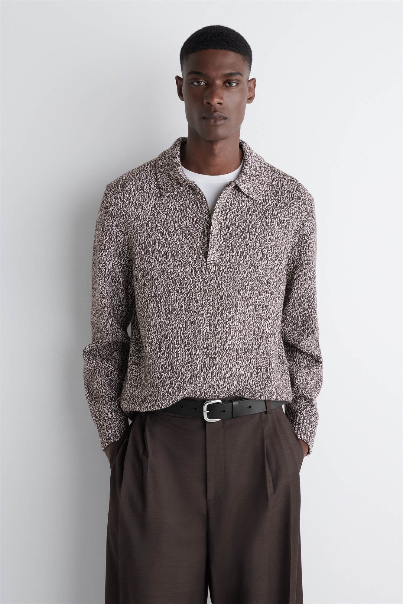 Дизайнеры мужской одежды предлагают современный подход к наследию в сезоне осень-зима 2025. Этот изысканный джемпер-поло вяжется швом 5 из хлопка и шерстяной пряжи RWS с вкраплениями белых и шоколадно-коричневых оттенков. Застежка на потайную молнию. Regular fitЗастежка на молниюЭто изделие содержит шерстяное волокно Responsible Wool Standard TE-00047206 (RWS) с ферм, сертифицированных в соответствии с требованиями к благополучию животных и землепользованию Состав: 54% хлопок, 46% шерсть RWS. Без учета отделки / Машинная стирка Длина по спинке для размера M составляет 64 см / Модель носит размер M
