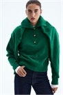 Джемпер из мягкого трикотажа с высоким ребристым воротником и металлическими пуговицами в виде узлов в верхней части. Спущенные плечи и длинные рукава, сужающиеся к манжетам. Ребрышки на манжетах и подоле.
