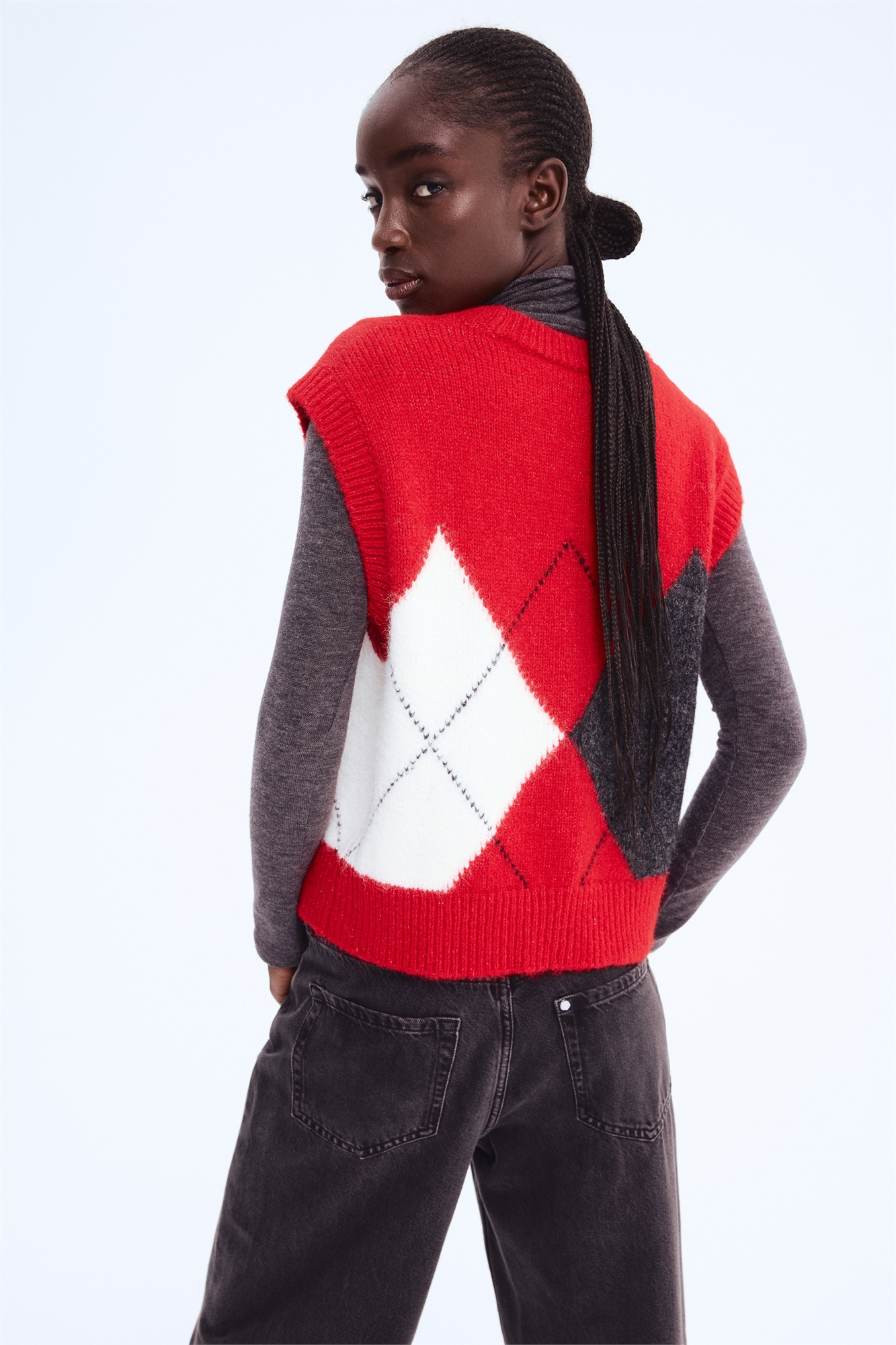 Свитер-жилет из мягкого жаккардового трикотажа с V-образным вырезом и спущенными плечами. Окантовка по вырезу горловины, проймам и подолу.