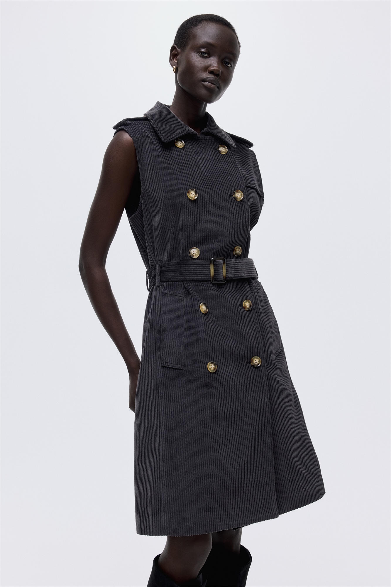 Двубортный тренч длиной до колена из хлопкового вельвета. Без рукавов, с отложным воротником, плечевыми планками с пуговицей, пуговицами спереди, накладными боковыми карманами и съемным поясом с пластиковой пряжкой на талии. На подкладке.