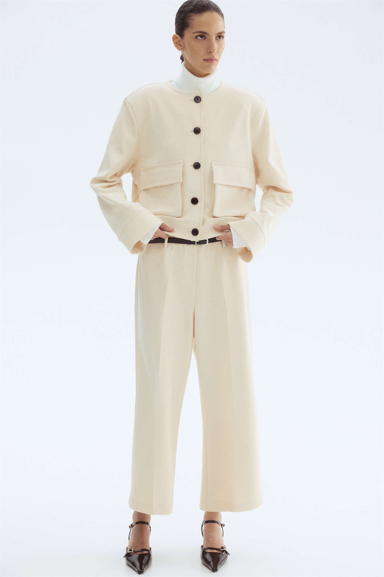 Короткий жакет свободного кроя из джерси с круглым вырезом и пуговицами спереди. Накладные передние карманы с клапаном, подплечники и длинные рукава с манжетами. Без подкладки.