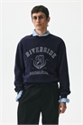 Топ из плотной хлопковой ткани в виде толстовки с принтом спереди. С круглым вырезом, спущенными плечами и длинными рукавами. Окантовка в рубчик по вырезу, манжетам и подолу. Свободный крой для пышного, но не чрезмерно большого силуэта.