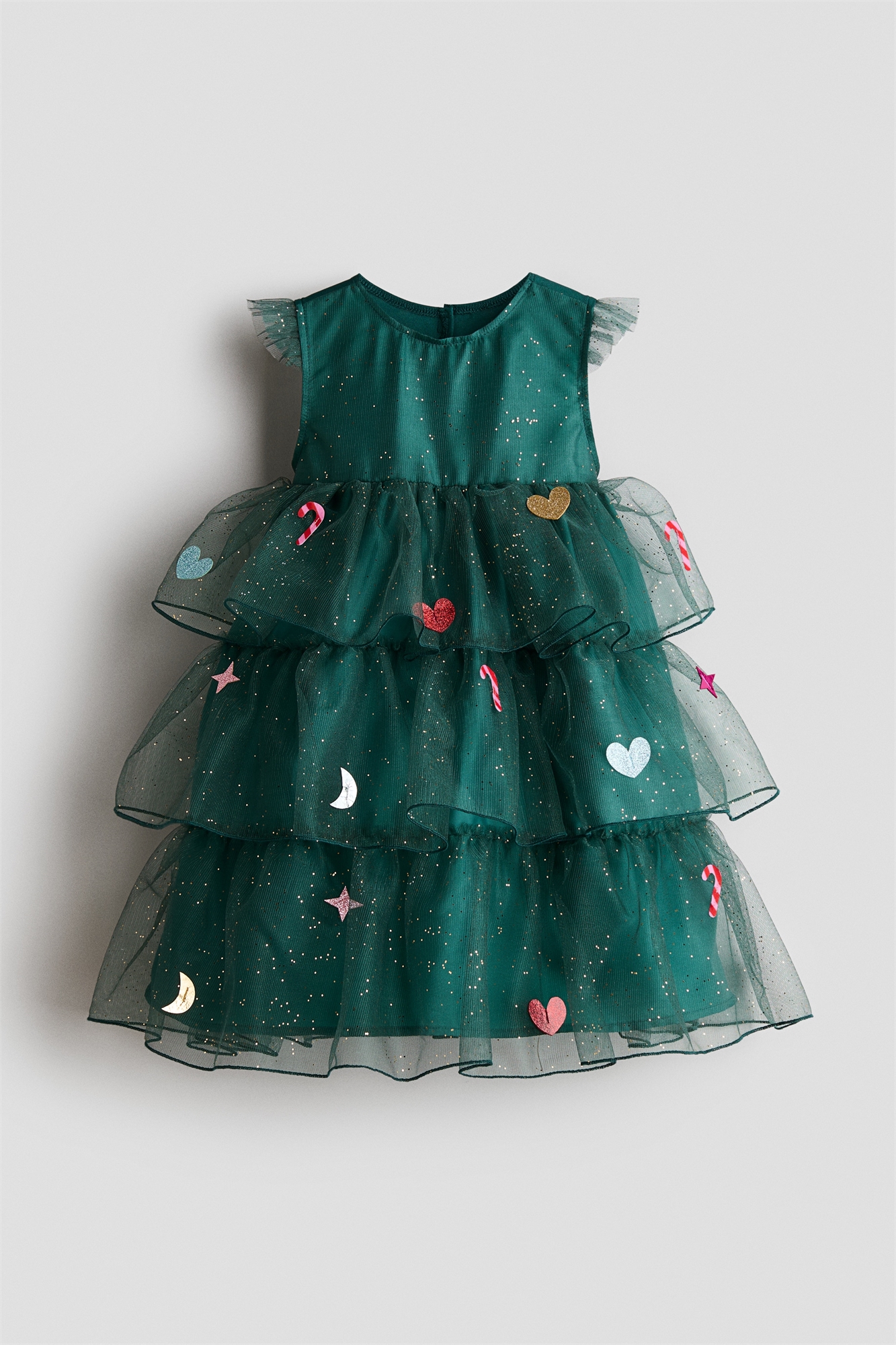 Маскарадный костюм из тюля, вдохновленный рождественской елкой. Круглый вырез, открывающаяся сзади застежка-крючок и оборки из тюля по плечам. Объемная юбка с ярусами, украшенными деталями в стиле рождественских украшений. На подкладке.