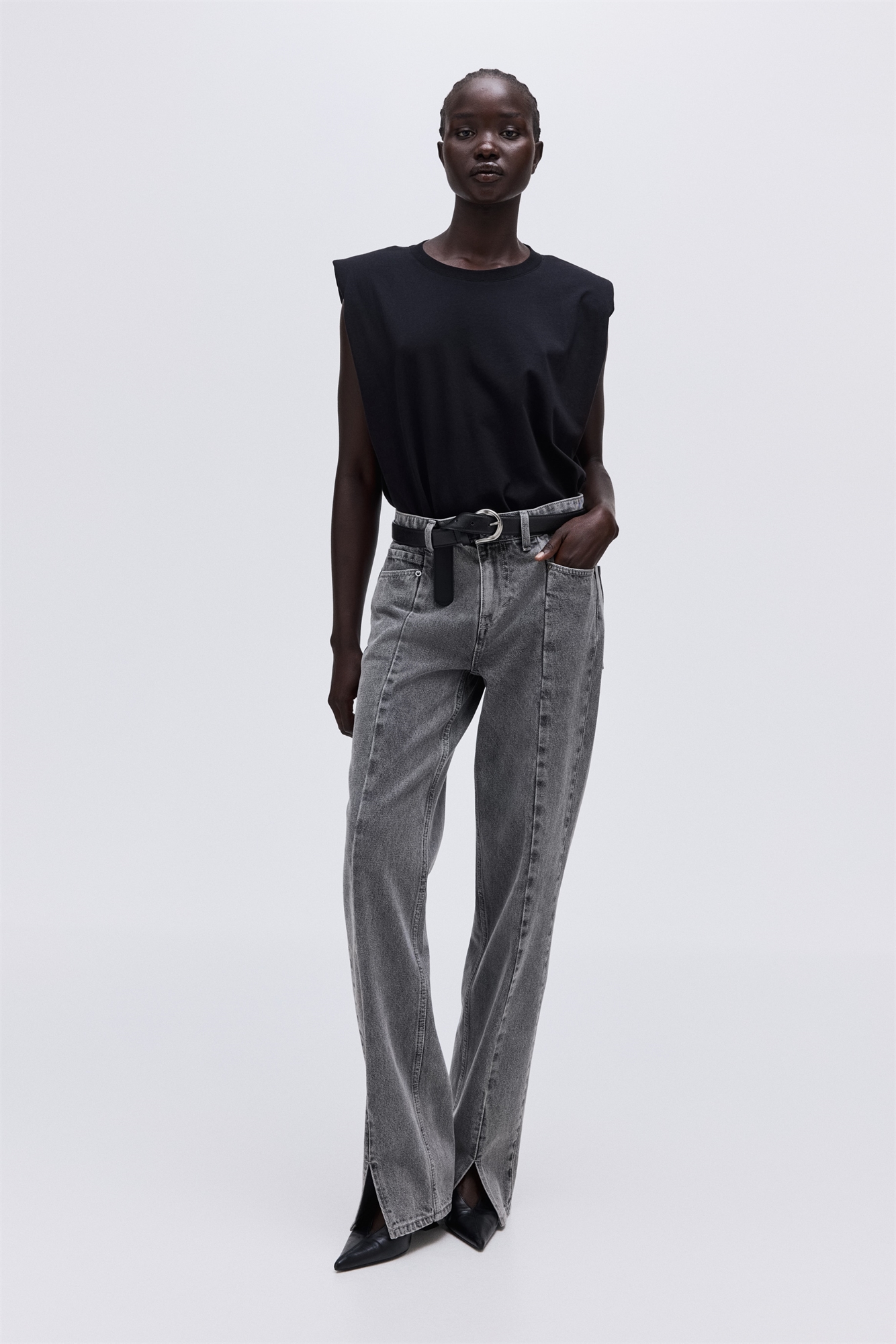 Джинсы с 5 карманами из жесткого хлопкового денима с обычной талией, ширинкой на молнии и пуговице. Прямые ноги с несогласованными швами спереди и сзади для придания образу экстремальности. Шлица спереди на подоле.
