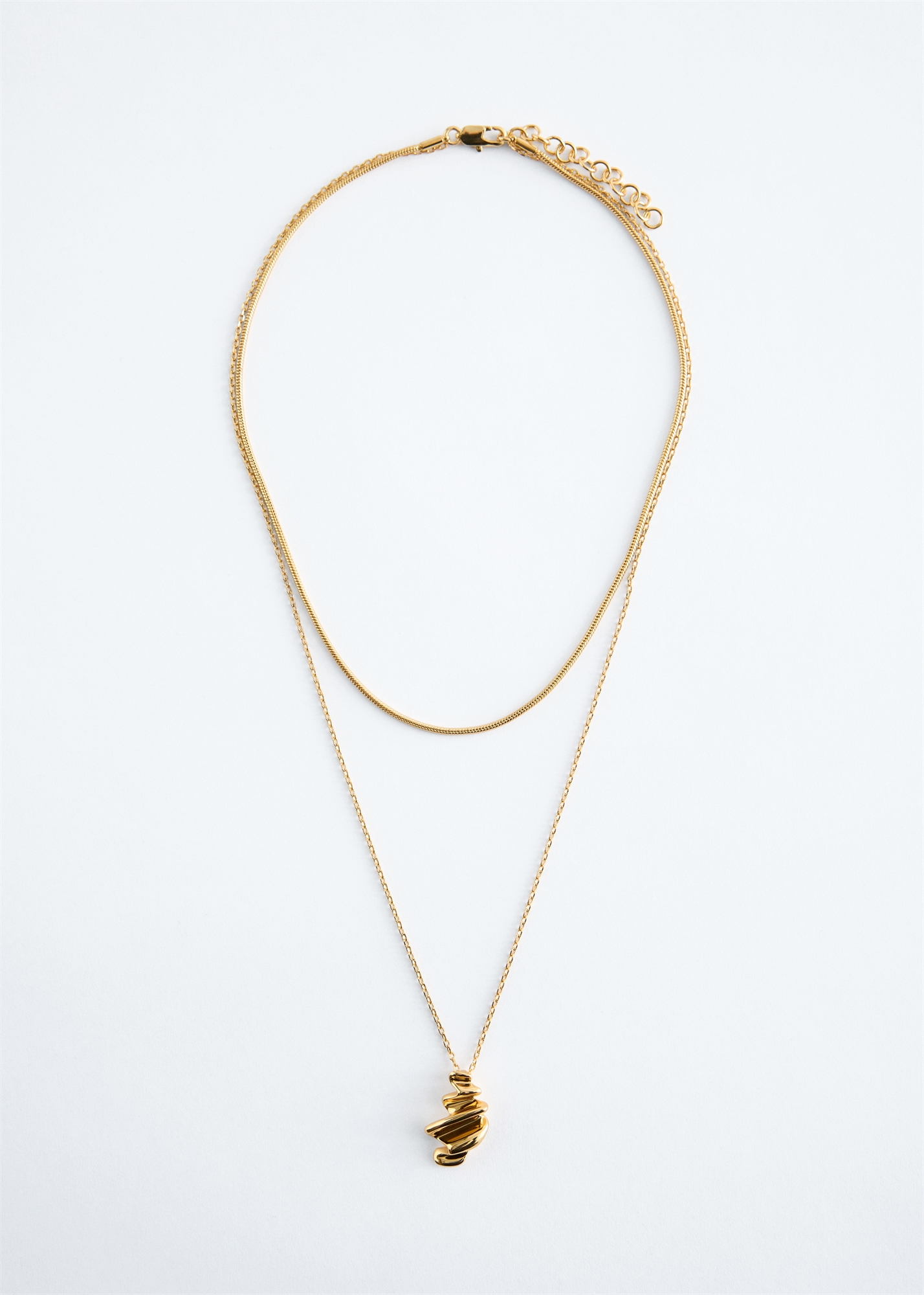 Это ожерелье из полированной латуни имеет многослойный силуэт с трубчатой веревочной цепочкой "елочка" и тросовой цепочкой, украшенной скульптурной подвеской с тонким рифлением. Регулируемая длина с застежкой-пусковым механизмом. Длина длинной цепочки: 52 см / 20,5” Размеры кулона: 1,1 см x 2,2 см / 0,4” x 0,9”