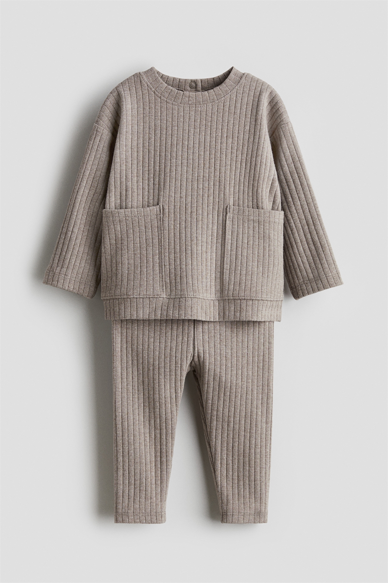 Комплект из джемпера и леггинсов из мягкого ребристого трикотажа, изготовленного из высококачественного хлопка. Круглый вырез, застежка на кнопки сзади и большие накладные карманы спереди. Леггинсы с регулируемым эластичным поясом. Коллекция H&M Adorables - это подборка удобных и качественных вещей, не теряющих актуальности.