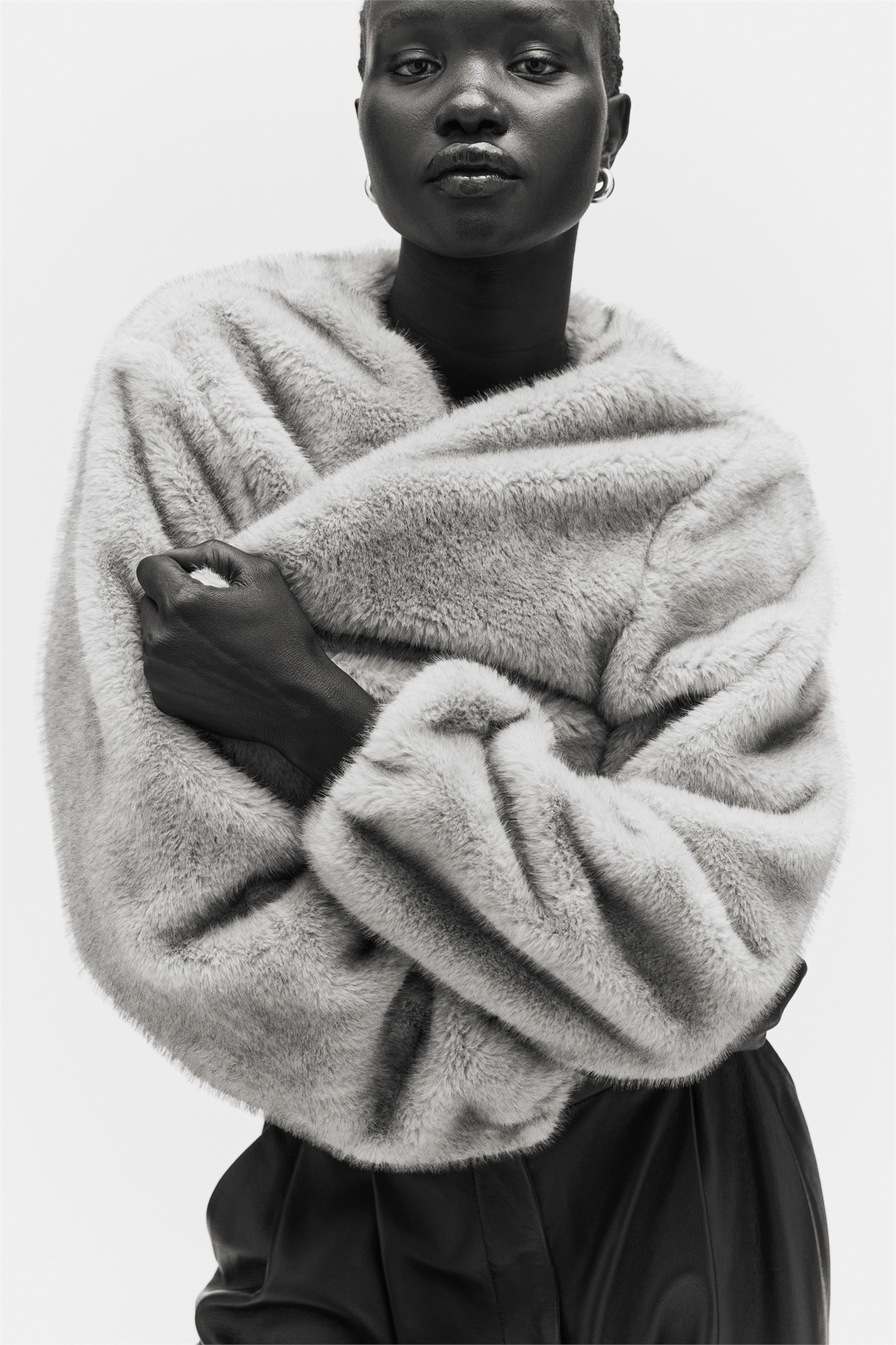 Жакет из мягкой пушистой ткани с круглым вырезом, скрытыми кнопками спереди, подплечниками и длинными рукавами. Скрытая эластичная резинка на манжетах и подоле для придания силуэту пышности. Подкладка из джерси.