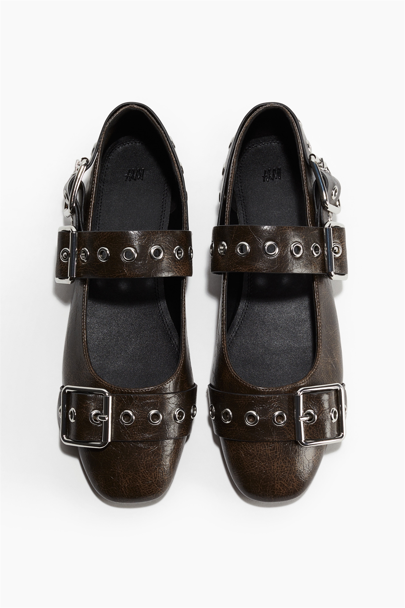 Босоножки Mary Janes из лакированной ткани, украшенные ремешками с люверсами и металлическими пряжками.