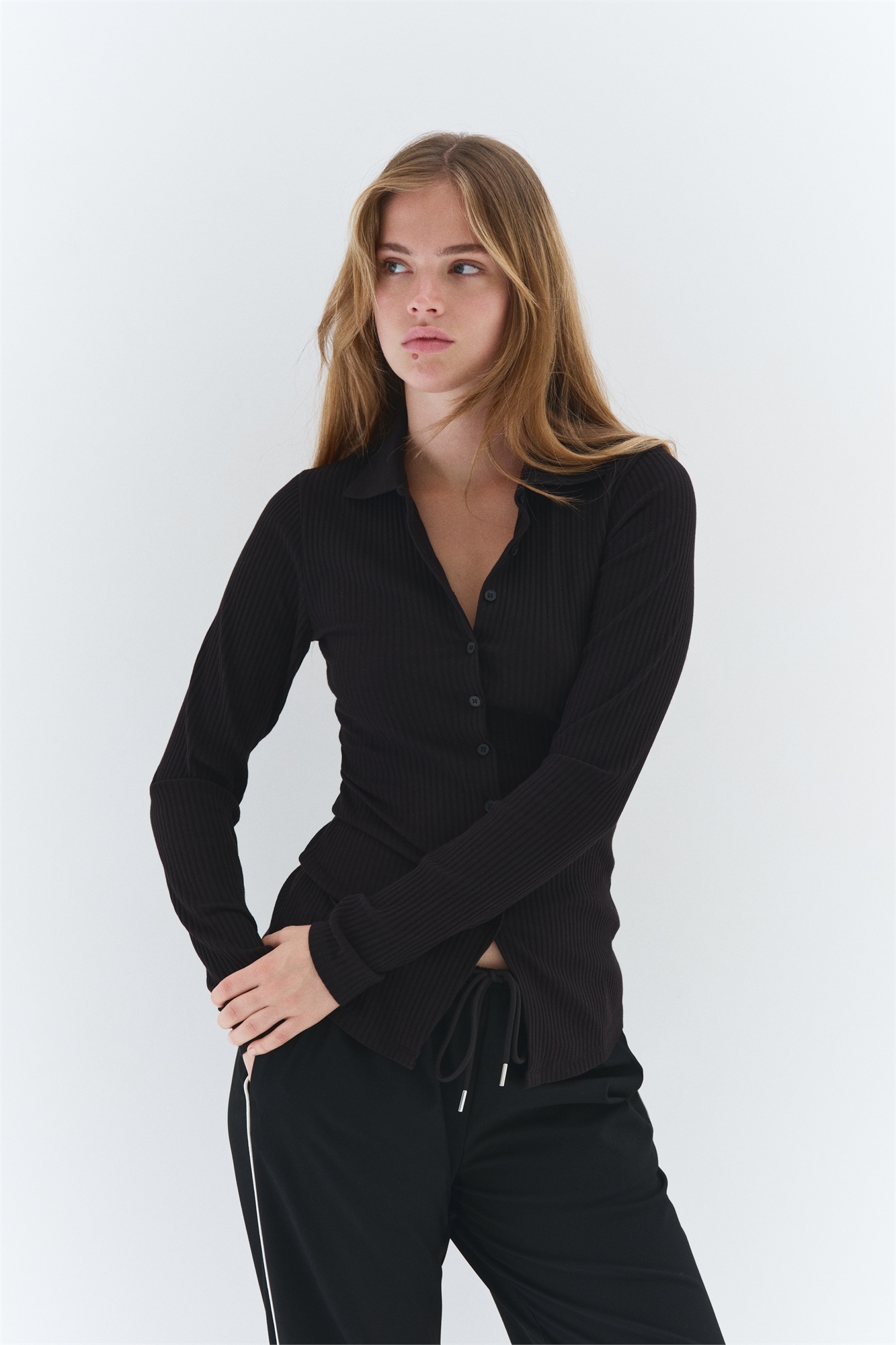 Приталенный кардиган из ребристого трикотажа с воротником, пуговицами спереди и длинными рукавами.