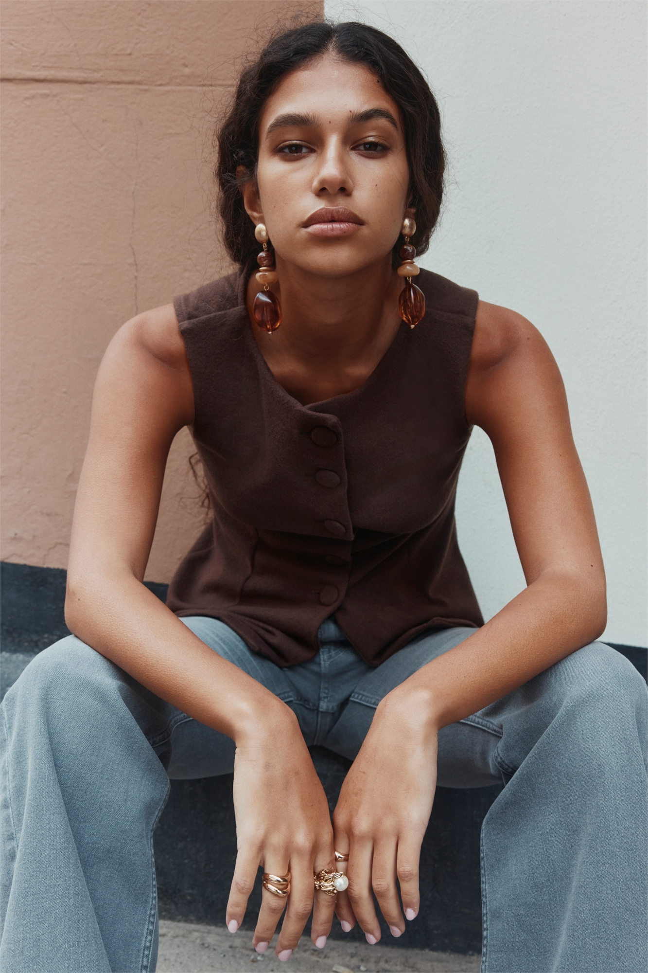 Приталенный жилет из джерси с круглым вырезом и закрытыми пуговицами спереди.
