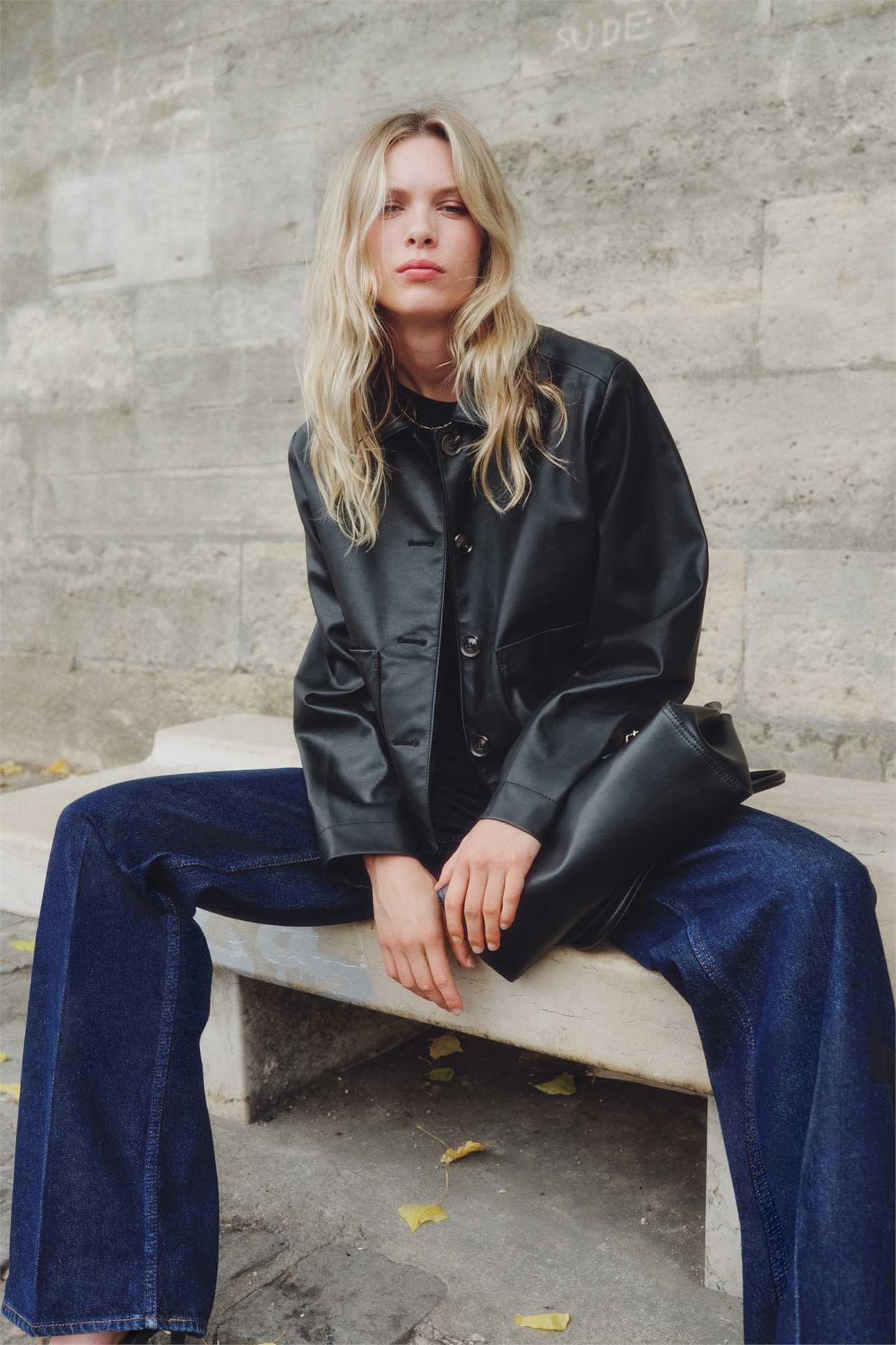 Короткий жакет из ткани с покрытием, воротник, пуговицы спереди и накладные передние карманы. На подкладке.