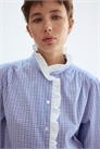 Блузка из хрустящего хлопкового поплина с пуговицами спереди и отделкой жабо вокруг воротника и по половине пуговичной ленты. Длинные пышные рукава с манжетами на пуговицах и сборками на плечах и сзади.