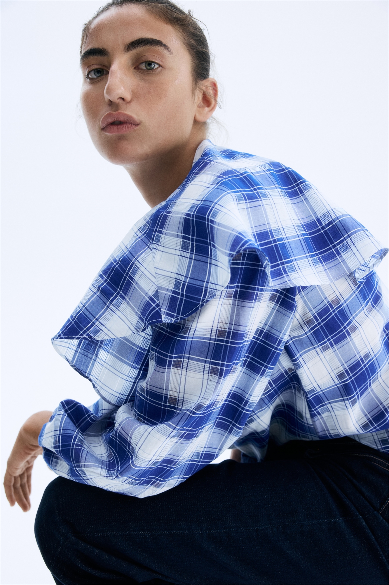 Блузка из тканого материала с накидкой в верхней части. Круглый вырез и пройма с узкими завязками спереди. Длинные рукава-баллон с узкими завязками на манжетах и закругленный подол.
