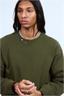 Толстовка с кремовым вырезом и приталенным силуэтом. Изготовленная из махрового хлопка средней плотности, она имеет ребристую отделку, спущенные плечи и двойные игольчатые швы. На манжетах и подоле имеются небольшие потертости.