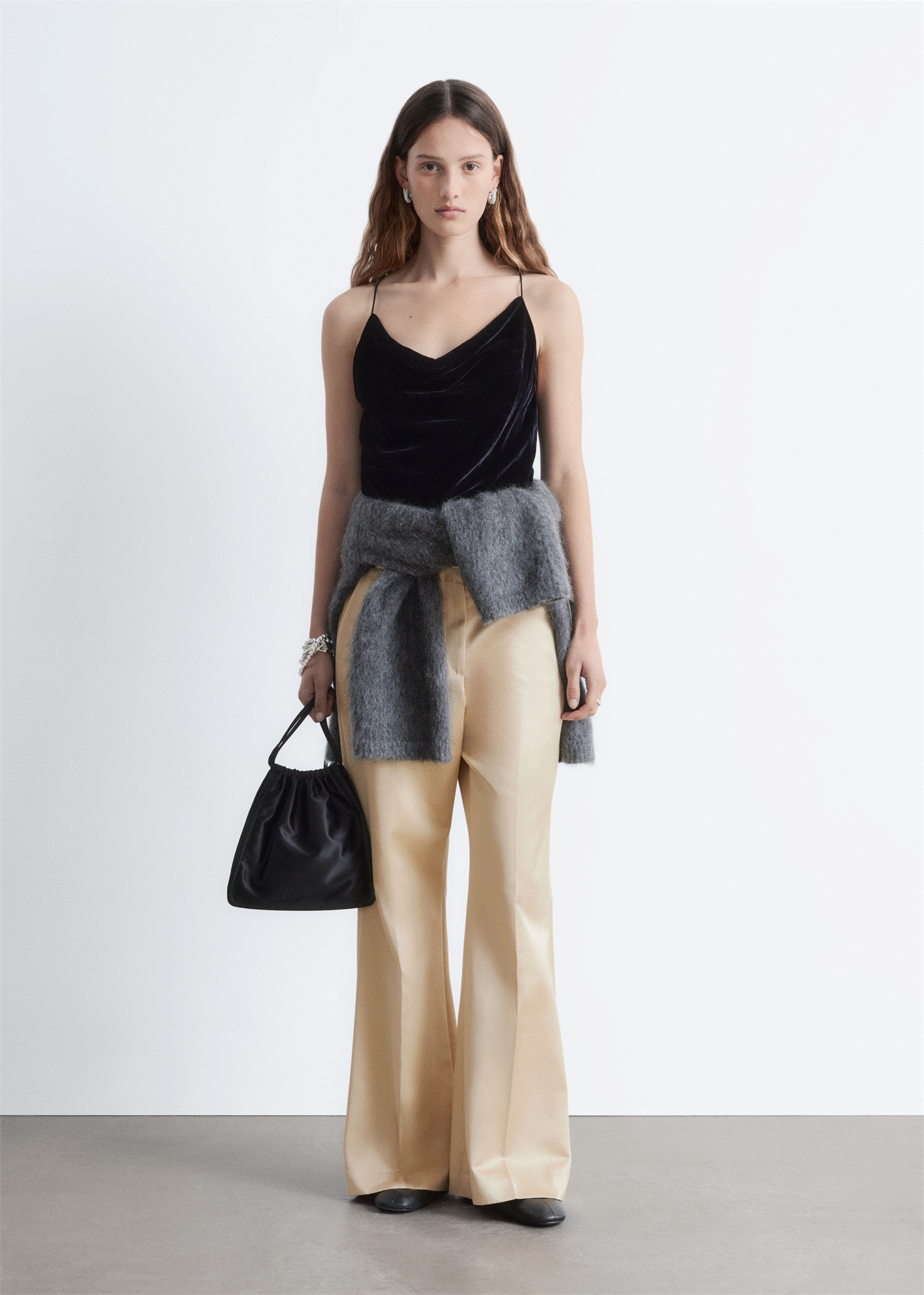 Эти брюки с удлиненными расклешенными ногами, подчеркнутыми острыми складками, и средней талией застегиваются на ширинку на молнии и застежку-крючок. Косые боковые карманы Петли для ремня Длина по линии бедер: 78,5 см / 30,9" (EU 36 / UK 8 / US 4)