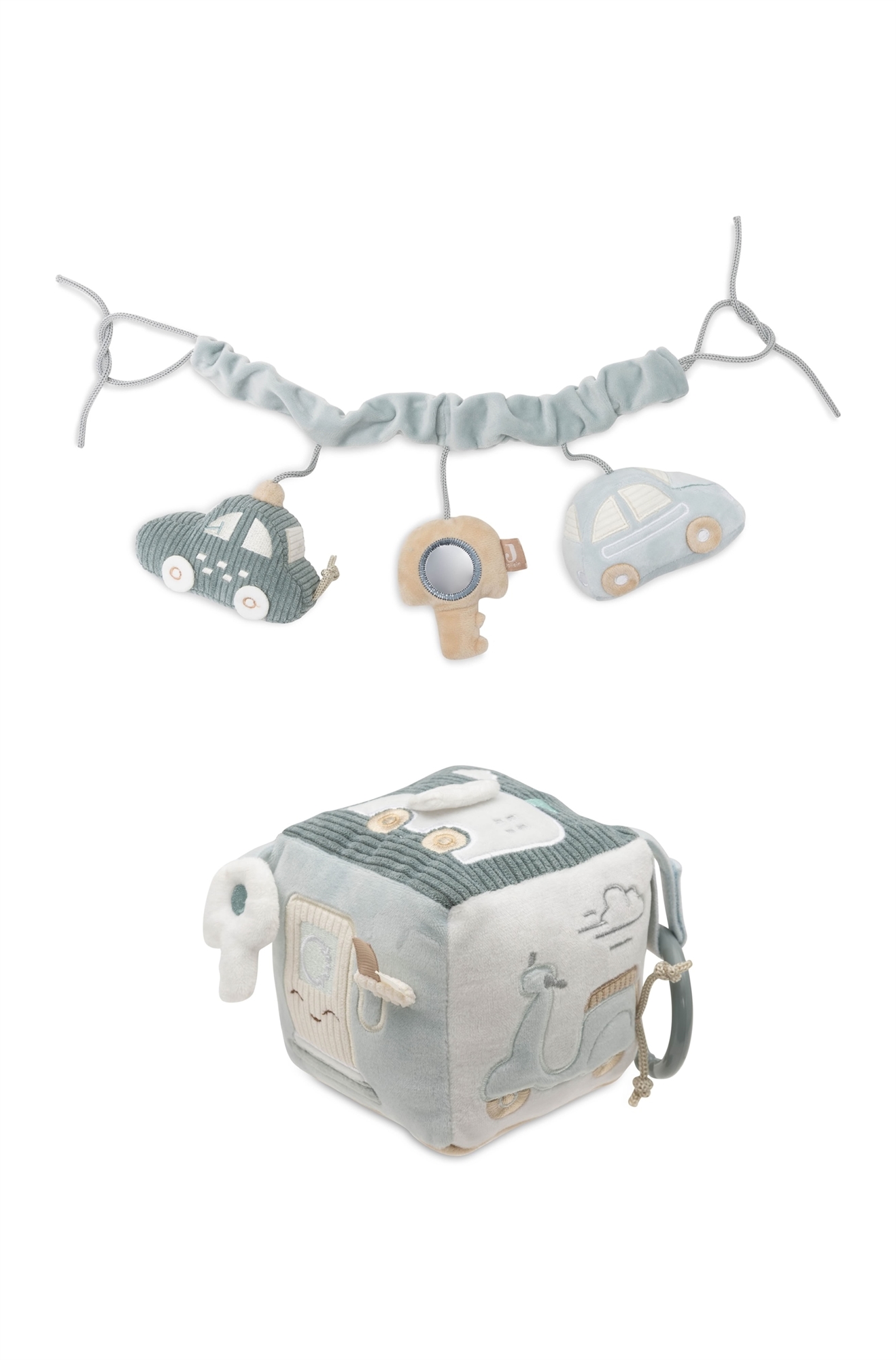 В этом наборе для коляски вы найдете цепь для коляски и кубик для занятий. Кубик для занятий из темы "На ходу" идеально подходит для любопытных малышей! Здесь есть симпатичный ключ с трещащим звуком, принт с изображением бензоколонки и светофор с зеркальцем, так что ваш ребенок сможет отправиться в путешествие за открытиями. Цепочка для коляски - идеальное дополнение к коляске. Цепочка для коляски состоит из трех симпатичных подвесок - машинки цвета морской зелени, ключика с зеркальцем цвета бисквита и второй машинки цвета голубого облака. Она идеально вписывается в тематику "В пути" и делает каждое путешествие немного интереснее! Размеры: цепочка для коляски: 60x20x4 см и кубик: 10x10x10 см.