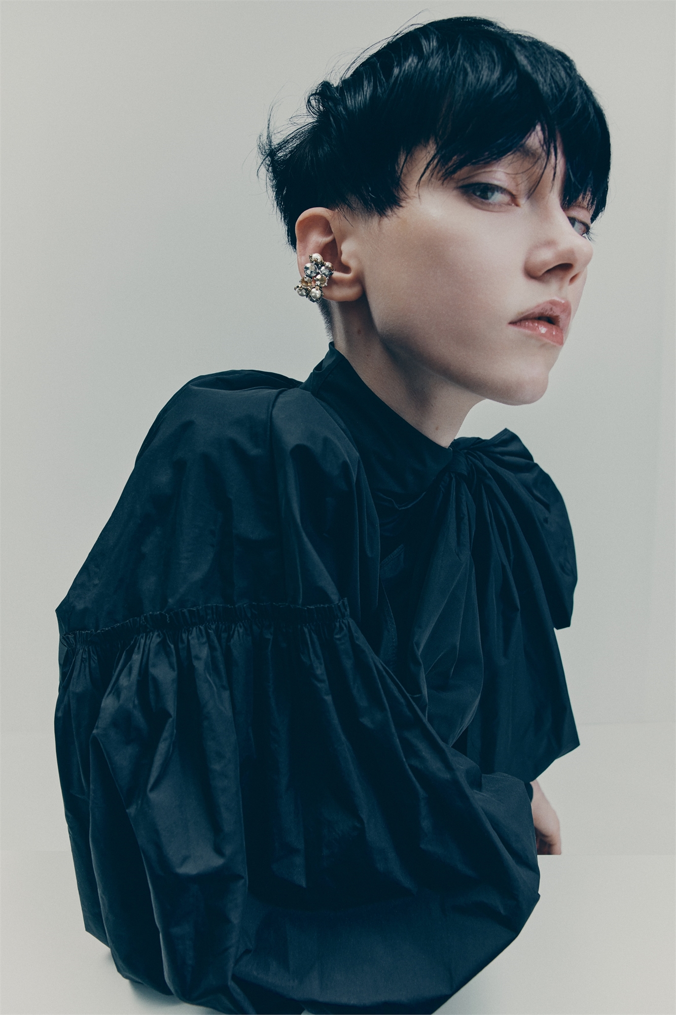 Двухцветная манжета для ушей из металла с потертой отделкой, украшенная сверкающими стразами и жемчужными бусинами.